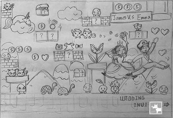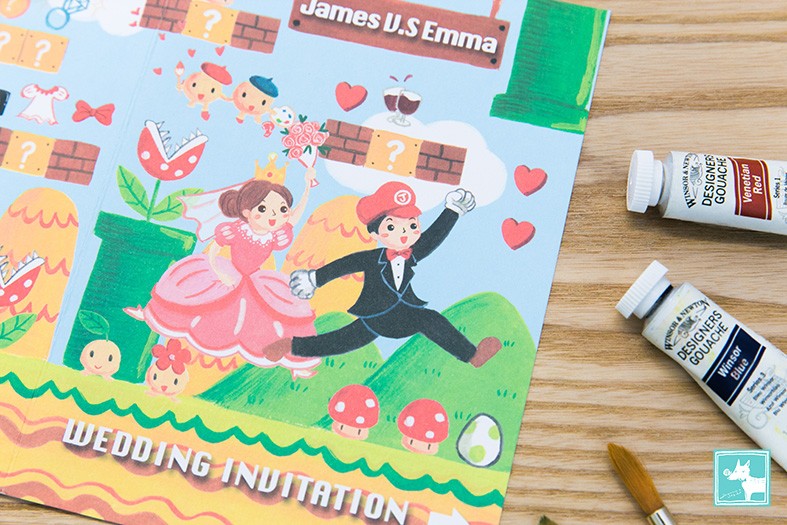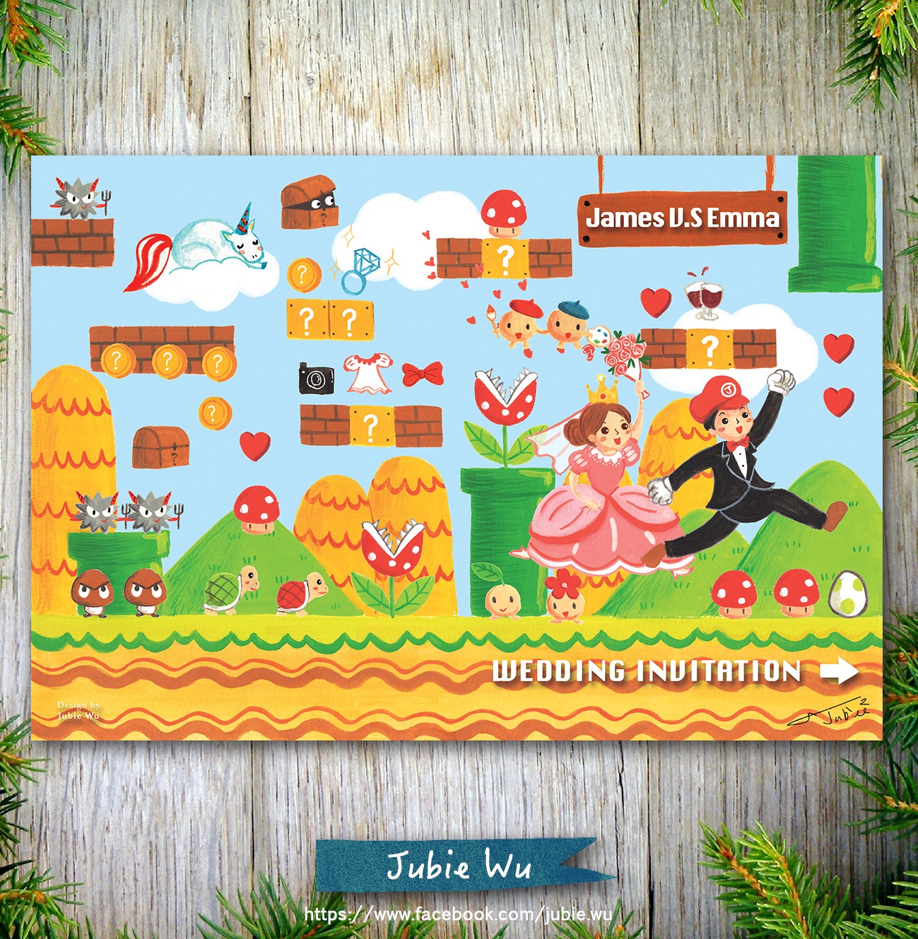 到了要看初稿的時間了,我的心情興奮又緊張,既期待又怕受傷害,但看到Jubie傳來的草圖,我又笑了,是一種勝利的微笑,她真的讓我太放心了!完全擄獲我的心。我和老公設定的主題是瑪莉歐和Peach公主,象徵我們的愛情就像突破層層關卡,要一起攜手面對嶄新的未來。她完全抓到重點,在童趣的風格中又融入了我們要的精神,作品既有她的味道,也有我們的故事。接下來就是等待上色,Jubie做事很有效率,過沒多久就傳來上色的圖給我們,當下的我真的只有感謝,我在心中吶喊:我真的超愛妳!謝謝妳,為我們設計了那麼棒的喜帖!沒有深厚的功力、天馬行空的創意和對繪畫的熱情,是達不到這樣的水準的!