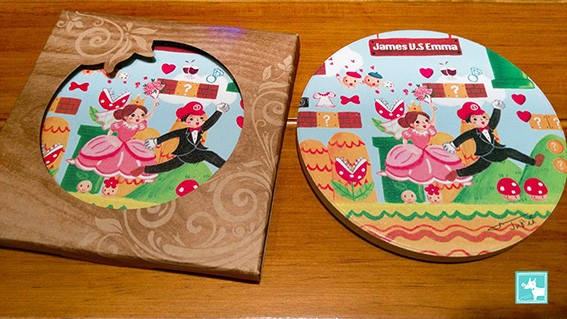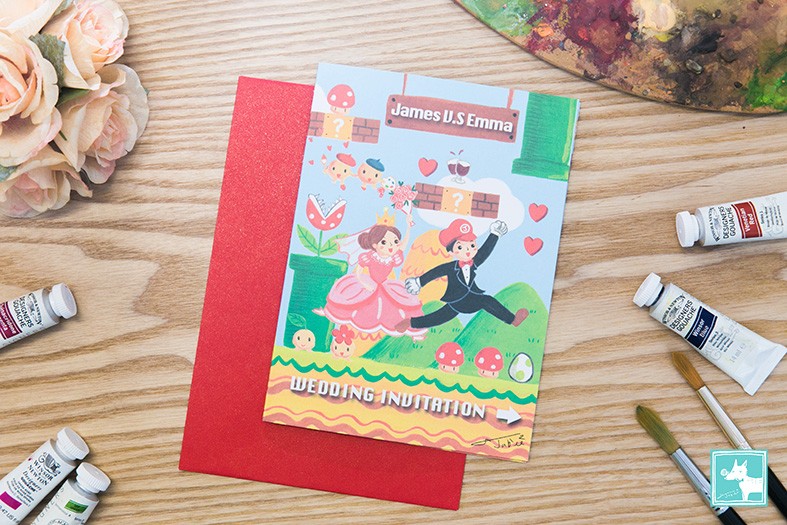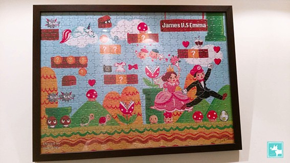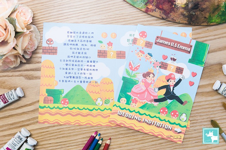 而最令我訝異的是,我那超級龜毛又麻煩的老公,看到Jubie的作品,就是呈現一種瘋狂的境界,因為他本來就是瑪莉歐的粉絲。Jubie最厲害的地方就是,你會看得出來這是瑪莉歐的主題,但卻沒有瑪莉歐的影子,而是Jubie Wu的風味。拿喜帖的那天,我又想尖叫了!這喜帖也太有質感了吧!從中可以看出繪者對自我要求甚高,這就是敬業和專業!當下我就訂了拼圖和杯墊,拿來佈置會場和探房禮,希望可以帶給賓客難忘的回憶!