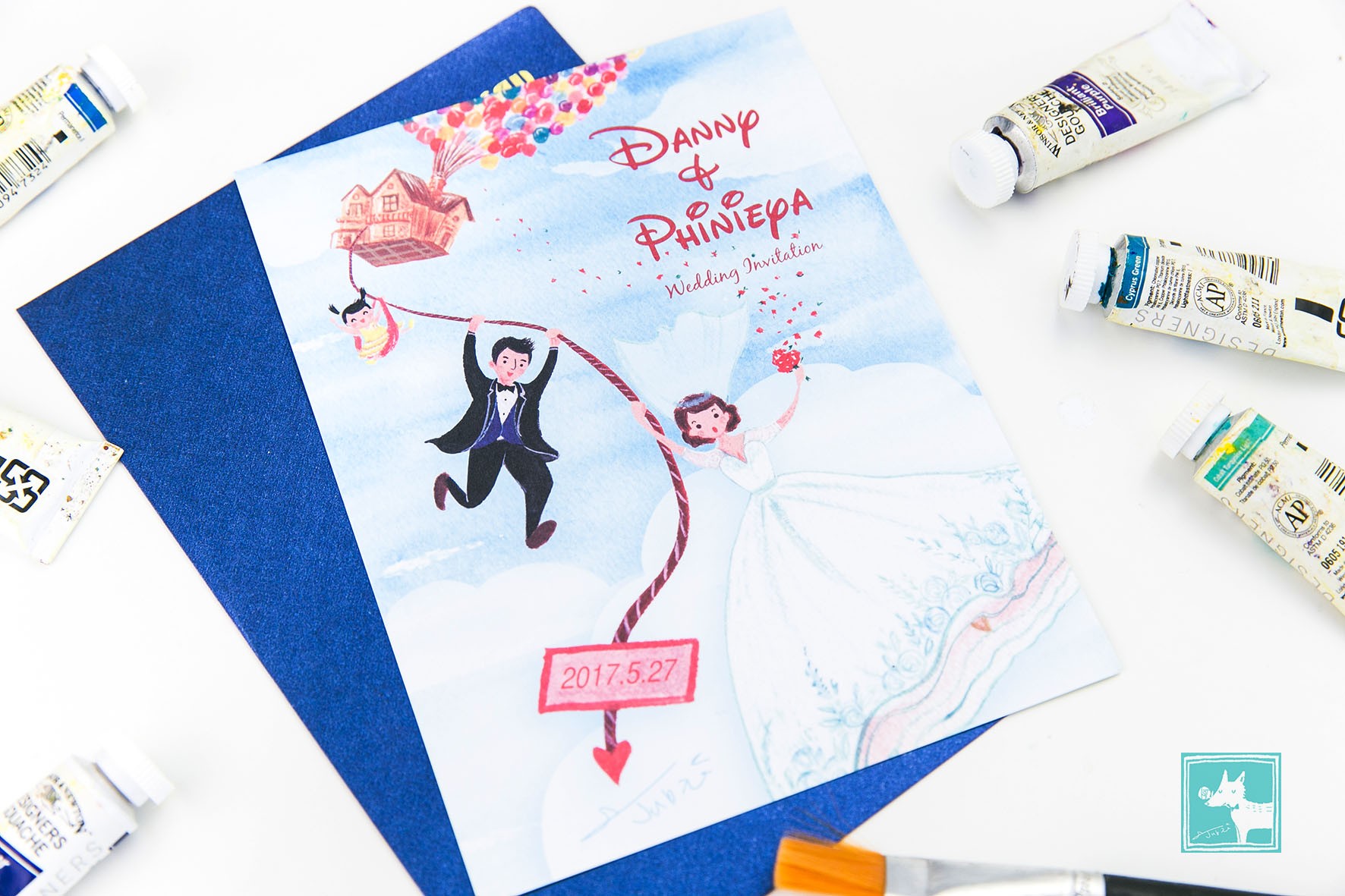 追尋風格的撞牆期有二年之久,直至開始畫插畫喜帖後,才漸漸鮮明穩定,「新人給我一個故事,我把它設計成一幅浪漫的畫,將他們的喜好、生活場景等重現在喜帖上。」從聊天、草圖、到上色等反覆溝通確認的過程,約需耗時一個月,這一張張幸福邀請函,就是一幅夢幻華美的插畫,賓客們拿到後莫不讚嘆說:「捨不得丟,要好好保存。」