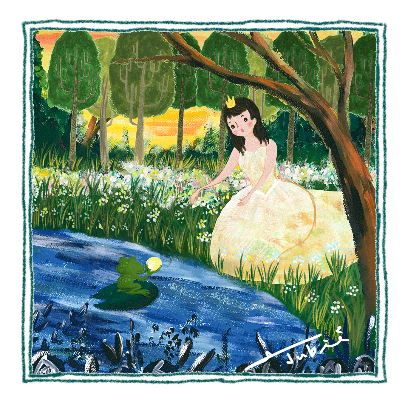 童話故事常常用青蛙、賴蛤蟆來象徵醜陋、噁心的形象,他黏糊糊而且住在又黑又深的水潭裡。原本帥氣的王子,被詛咒變成一隻醜陋的青蛙,相較於美麗又高高在上的公主,是個卑微的存在。因此儘管公主每天在潭邊玩,自卑的青蛙卻從來不敢出現,唯有當公主的小金球掉到潭裡的時候,才敢借此冒出頭來。