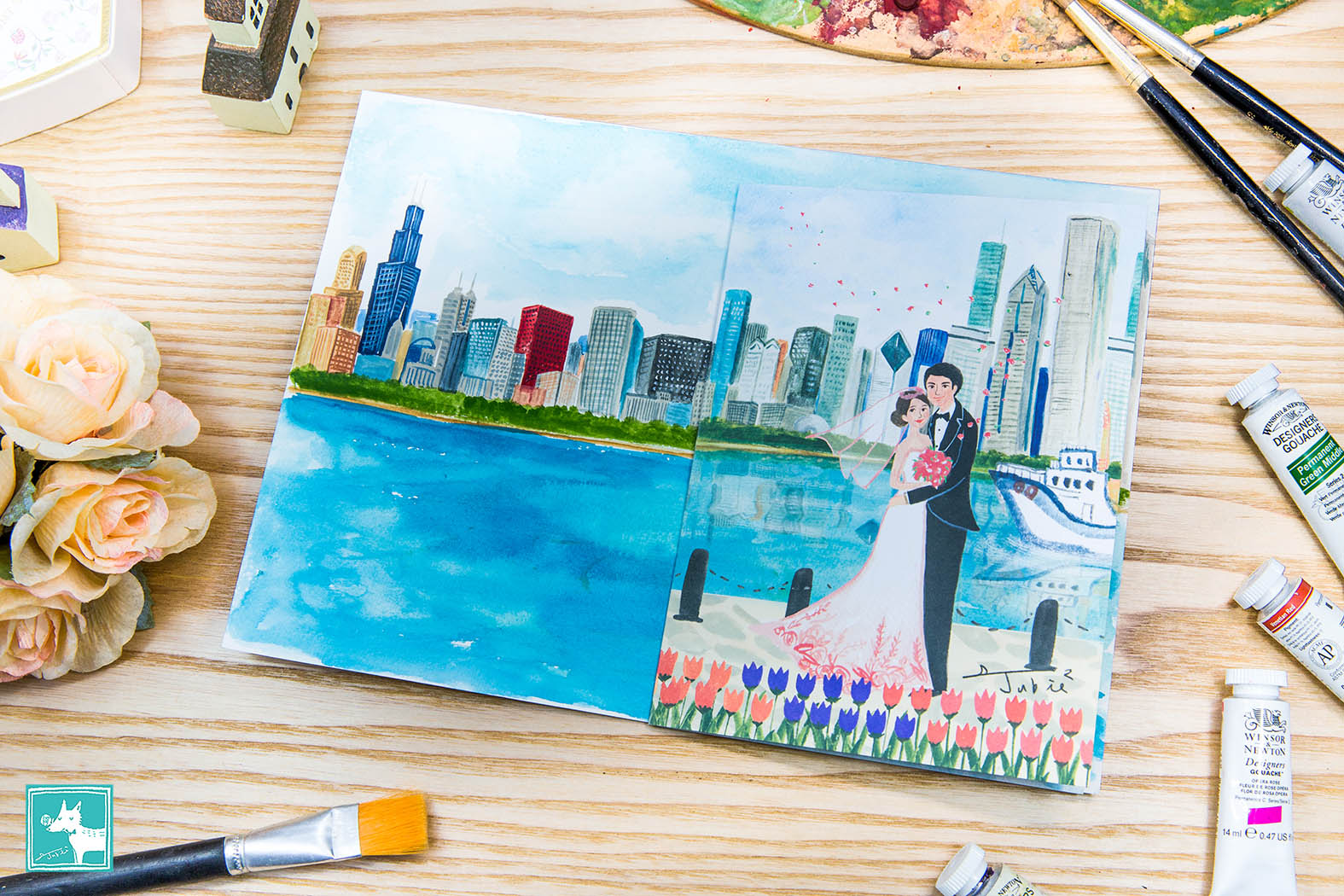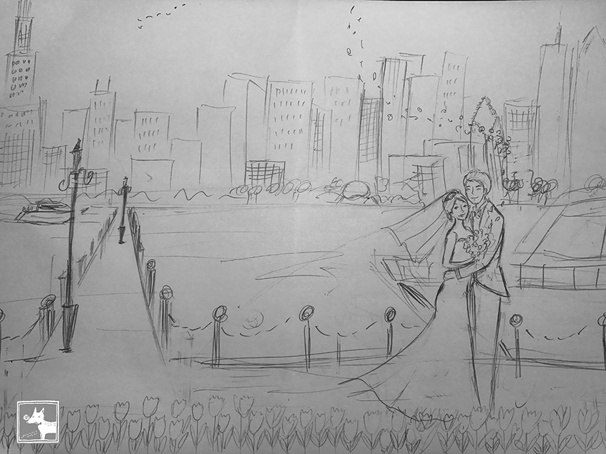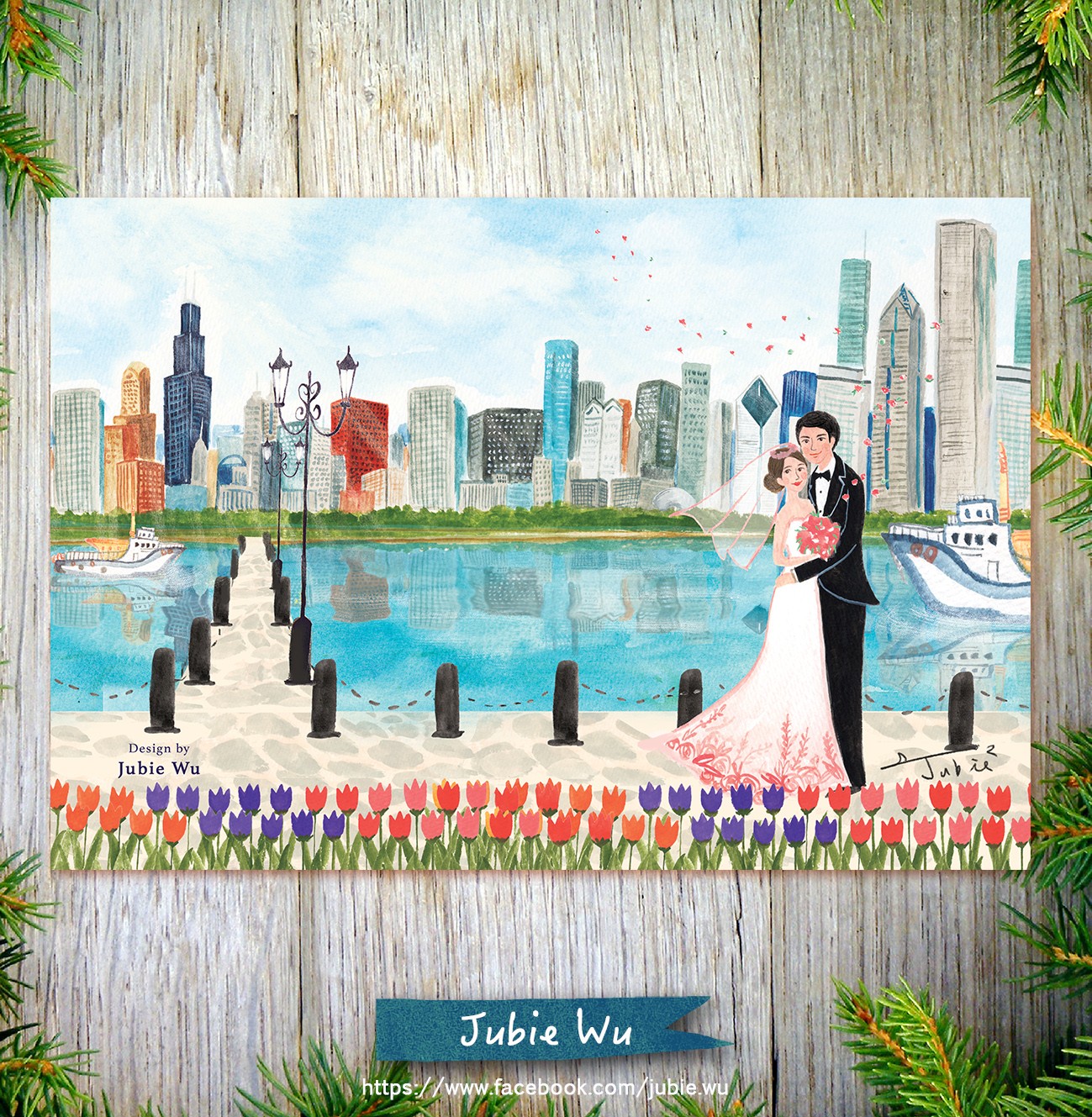 這對新人的愛情長跑要從高中說起,兩個人都就讀雄中,女生更是音樂班的才女。從高中就在一起,一直到大學畢業,然後再一起出國讀研究所。喜帖的背景是兩人目前居住的城市芝加哥,也是兩人宣告新身份邁入新生活的幸福之地。在遠端洽談時Jubie可以感受到新娘的健談和可愛,聊得非常開心。儘管沒有親見到這對佳偶,但腦海裡已經充滿畫面了!陽光灑在芝加哥天際線,微笑相擁的新人,彷彿擁有了整個城市的祝福和見證!希望這幅清新又充滿回憶的喜帖能讓新人深深記得,從過去、現在到未來,始終如此相愛!