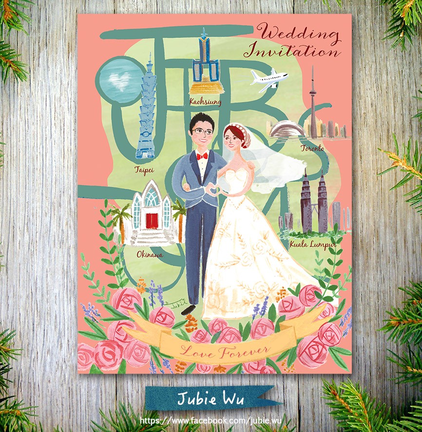 想著,若是自己幸福到來的那一天,是否也可以用最獨一無二專屬我們的方式昭告天下,比如說:客製化的手繪喜帖!開始籌備我們婚禮時,瀏覽大小網站,尋找符合我們理想的插畫家,其實這過程有些挫折,畢竟手繪喜帖的潮流在國內還不是那麼風行…。然而,偶然在一篇報導裡看到Jubie的專訪,好奇點進去看畫者作品,人物的俏皮刻畫、邊框花草的溫暖用色,當下決定,就是她了!隨後立即積極地聯絡Jubie,很快地就收到她的熱情回信,由於我們長期旅居海外,某次回台相約碰面談細節,Jubie本人好年輕也好親切,對於我們的客製內容,也給予許多參考的大方向,談話過程一拍即合,迫不及待要看到我們的專屬喜帖了!