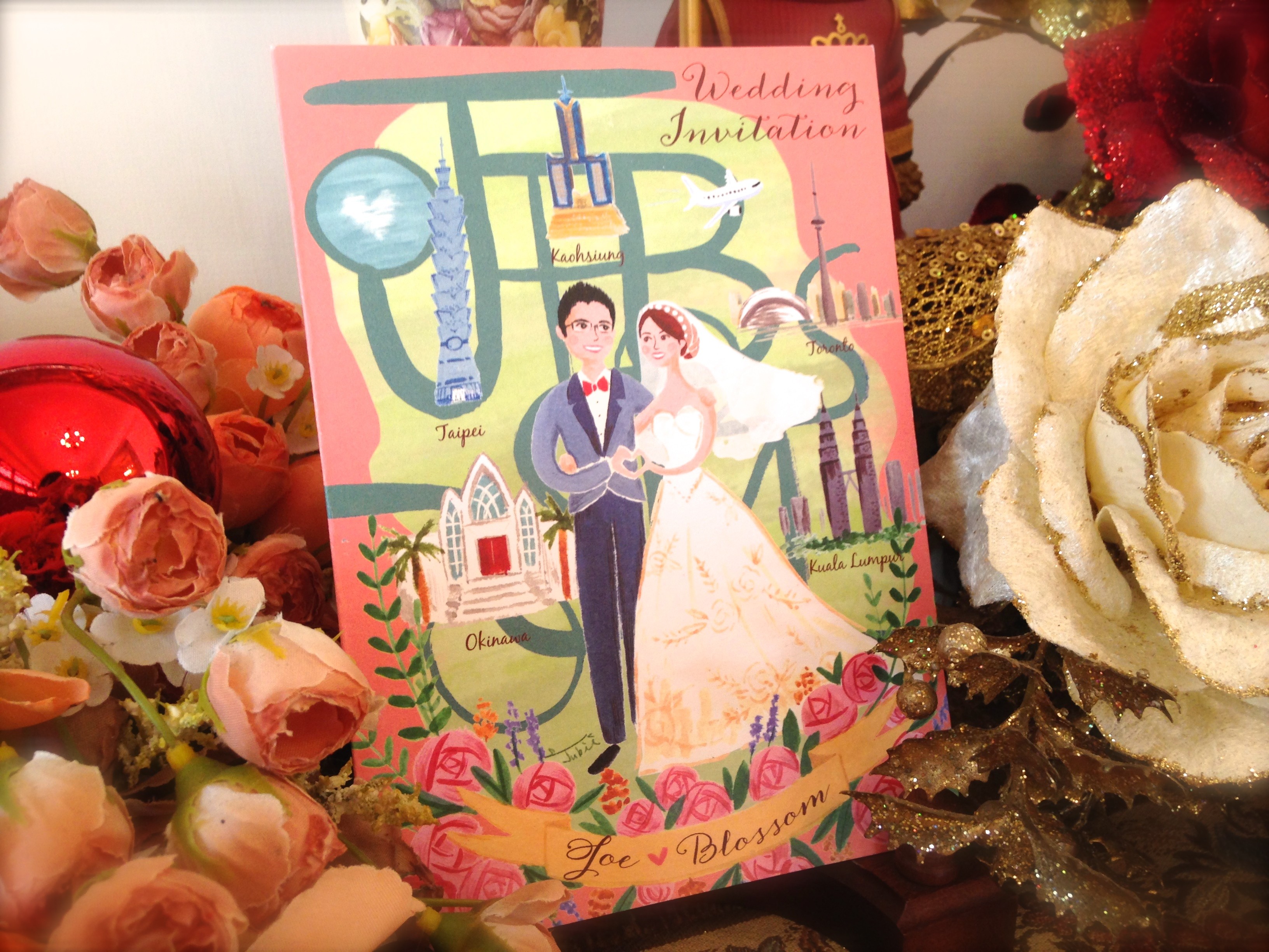 直到最近收到成品,果然非常符合期待,好喜歡我們的卡片唷!卡片上手繪的新人臉上甜蜜笑容展露無遺,邊邊的花花草草呈現屬於我們的幸福氛圍,各地的建築物也都畫得栩栩如生,對於這樣的專屬真是愛不釋手!很期待收到我們喜訊邀請的親朋好友,看到這獨一無二的客製卡片,能感受到我們的幸福、接收溫暖,一同來為我們祝福。