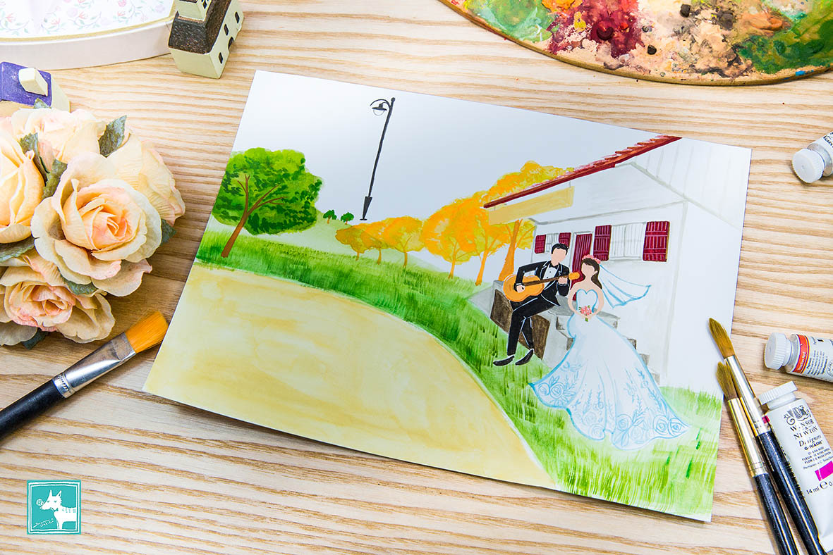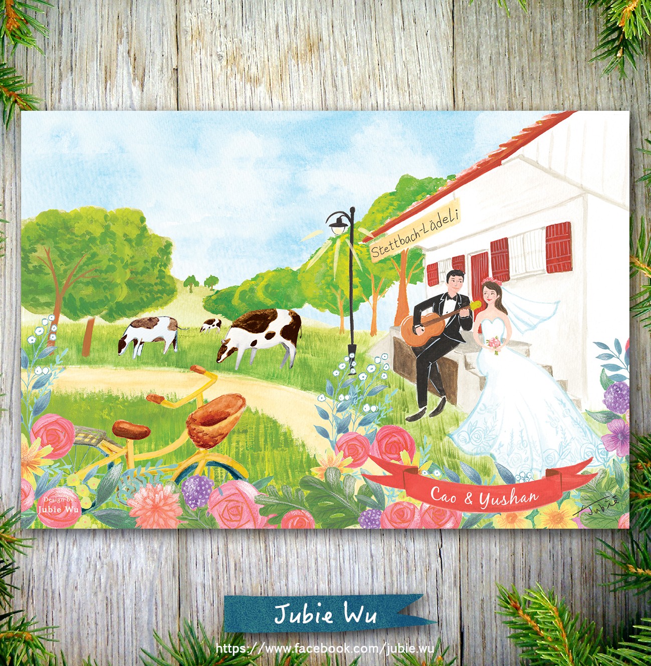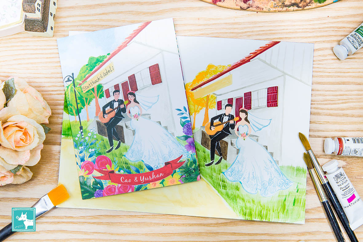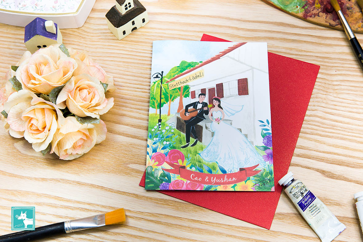 瑞士的新人透過網路洽談,給Jubie看了一張又一張美好寧靜的鄉村景致,「這是在我們家附近,每天都會經過的雜貨店,想把它畫進喜帖裡。」非常可愛的小雜貨店,靜靜地站在鄉村草坪上,像是最可靠的鄰居,守護著我們的愛情,和嶄新的生活!