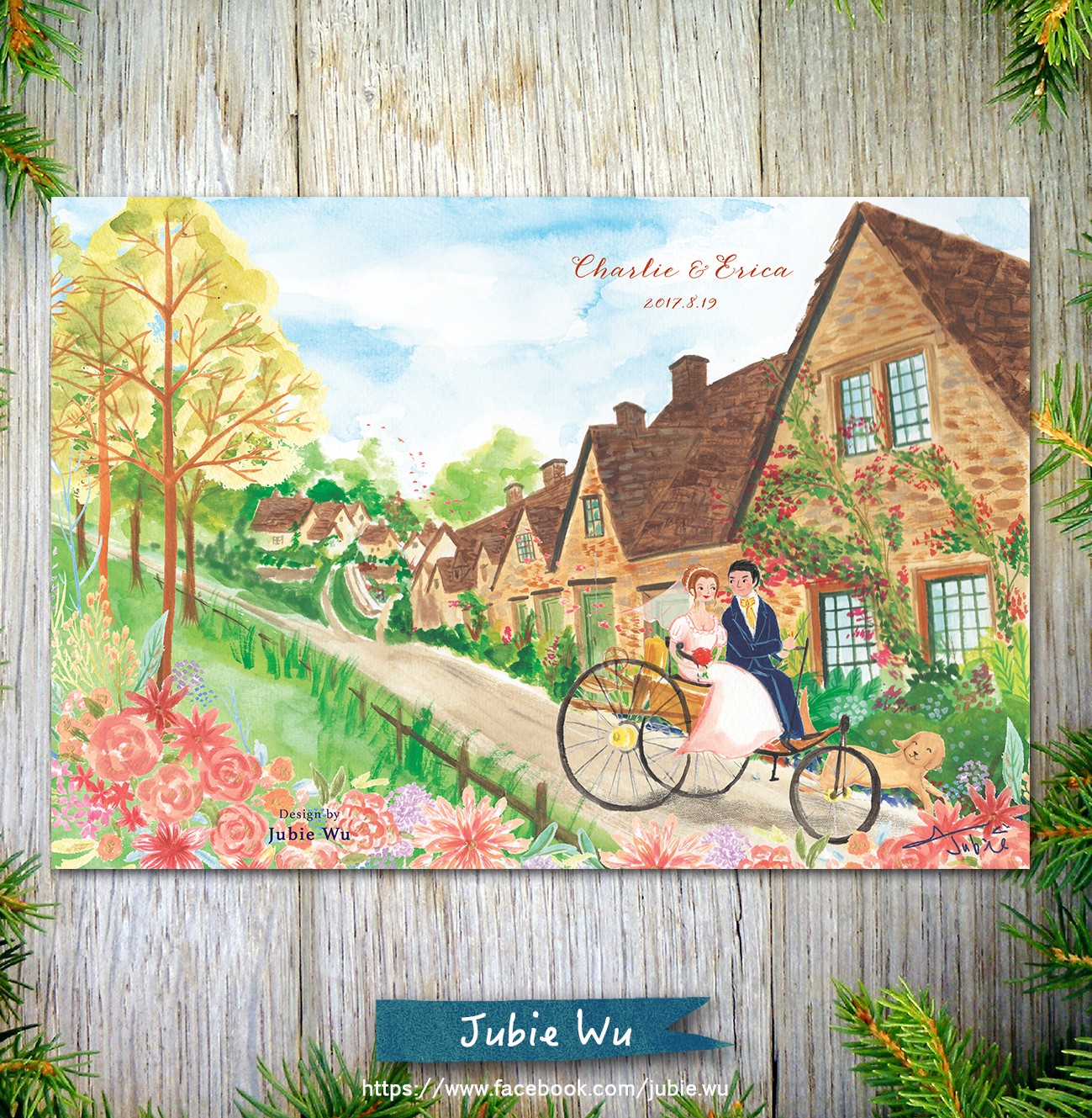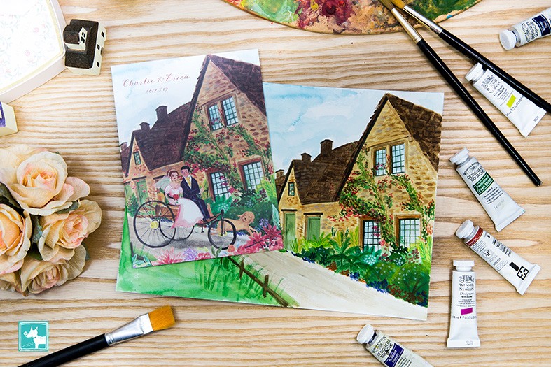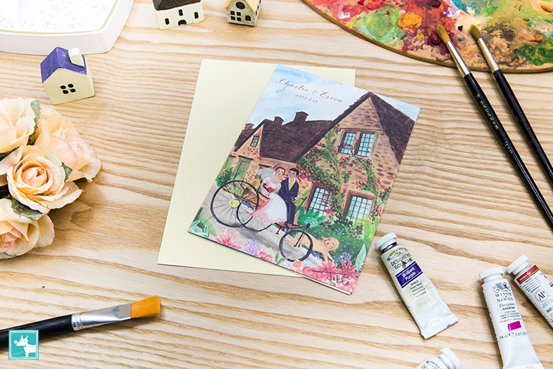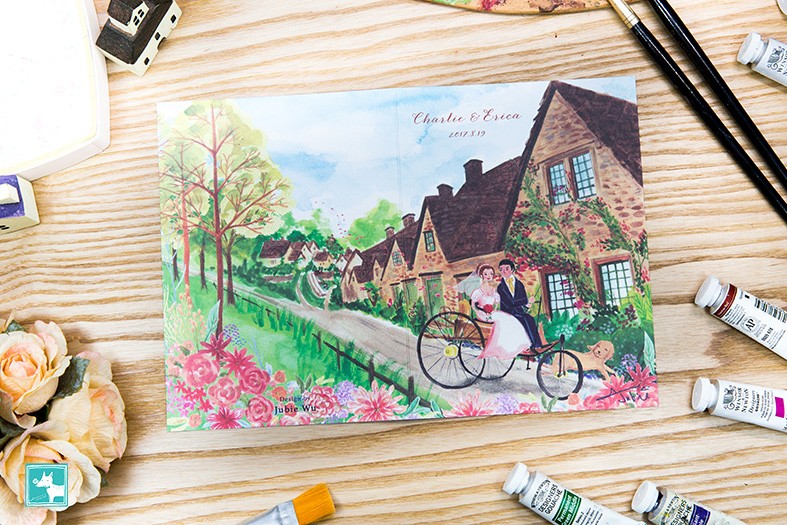 當初對於喜帖其實並沒有太大的想法,在朋友的介紹下,看到了Jubie的作品便當下決定要請Jubie為我們設計喜帖,因為Jubie的手繪讓每張喜帖都充滿了故事及紀念性,所繪出來的人物與插圖,都是獨特且客製化,是屬於新人自己的回憶,同時可做紀念性的喜帖。當初,我們跟Jubie說想要英國鄉村風,兩個人坐在三輪車上(當然這三輪車是有特殊意義)從鄉村小路出來,並且傳了幾張參考的照片給Jubie看,一開始覺得不太確定Jubie是否可以理解我們想要表達的感覺?但與Jubie約見面洽談,她會細心的詢問新人想要放在喜帖上的元素有哪些?透過聊天了解我們之間的回憶或故事細節及最後想呈現出來的風格、色調等。再根據她的經驗,給我們一些建議,在這過程當中,Jubie也都會細心的記下細節,並一一確認。看到完稿及收到成品,完全與當初我們在腦海所想像的是一模一樣,真的很喜歡!!!收到的親戚朋友都說很漂亮別緻也很特別,是會想好好保存下來的喜帖。從草圖到最後的完稿,Jubie都會一再跟我們確認細節及構圖是否需要修改,非常的細心且負責,並且在時間內交付給我們,配合我們要寄送的時間,品質都讓人非常滿意,讓人覺得很可靠。Jubie的手繪讓喜帖變成不只是單純的告知婚宴時間地點,也讓親戚朋友們收到的時候感到溫暖與親切。