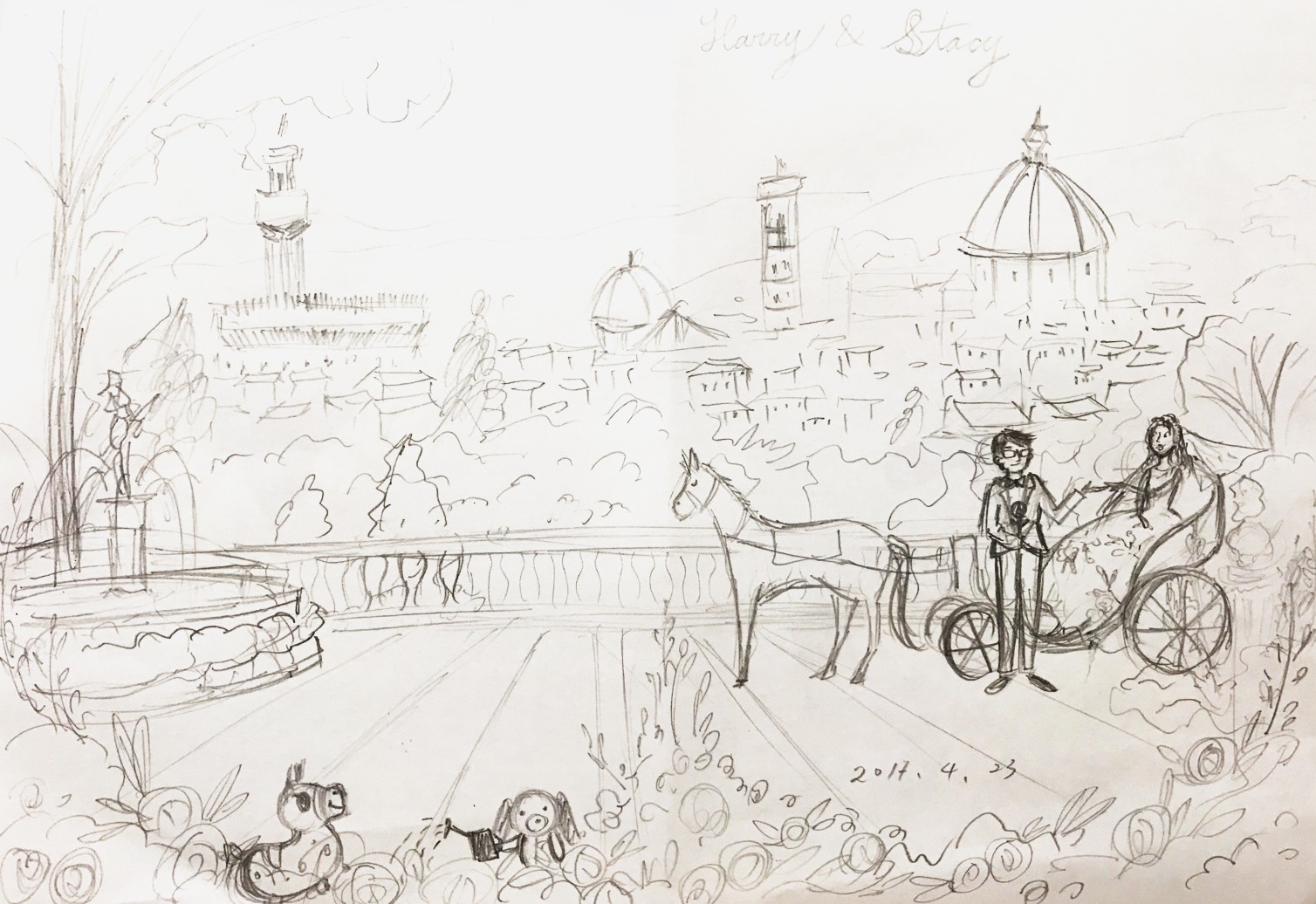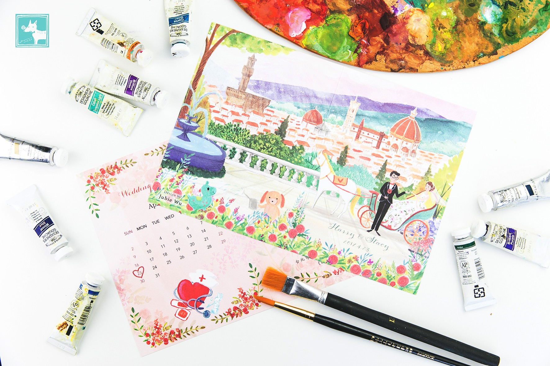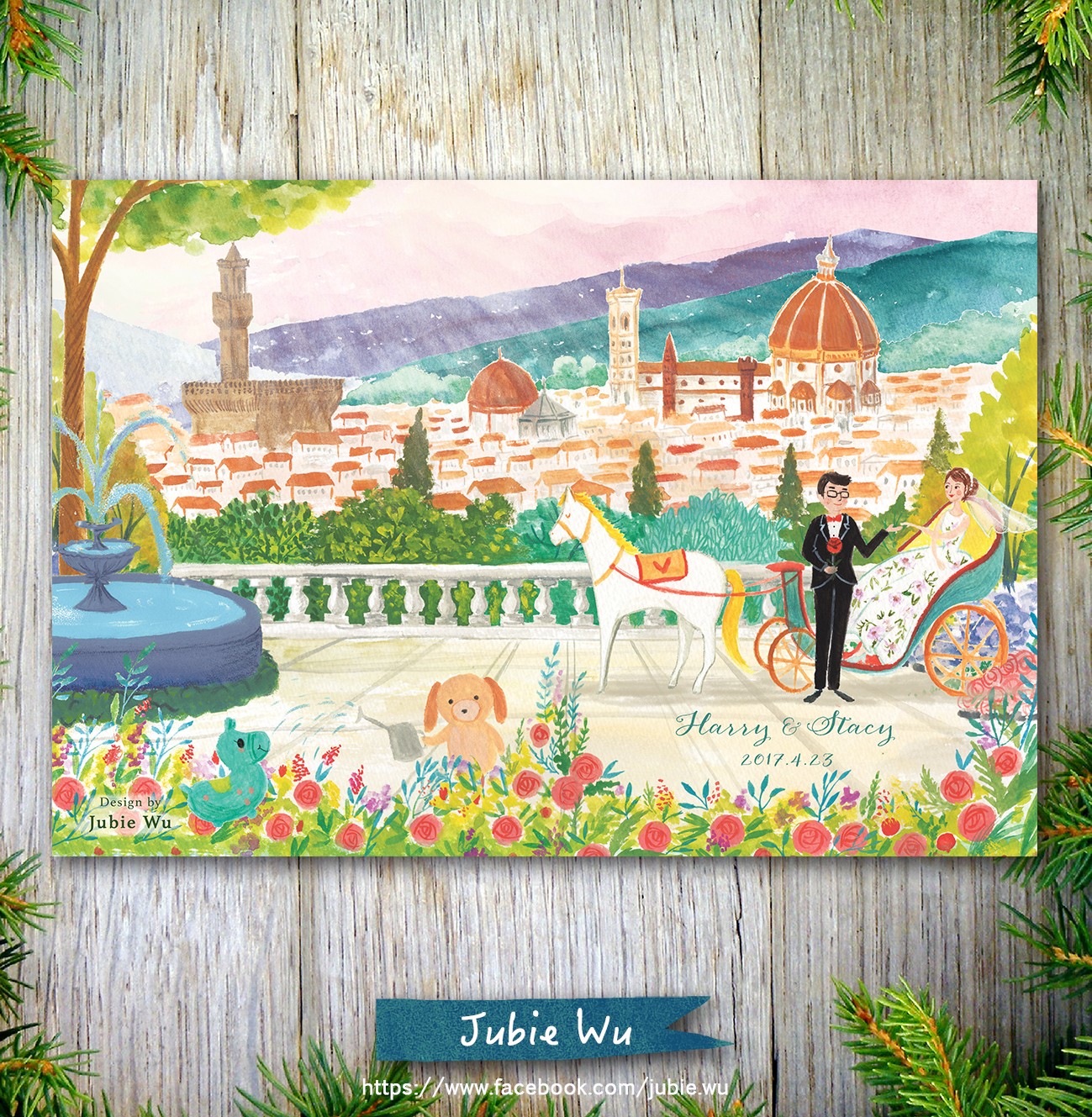 必須要說,這份喜帖的創作過程太療癒了,尤其領略到「每個新娘心中的完美禮服」、「每對幸福滿分的新人通常有一對意義重大的可愛娃娃」等細節,充滿了繪製喜帖以外的小趣味啊!感謝可愛的斐跟Jubie分享了這麼美好浪漫的佛羅倫斯,也很開心這份喜帖讓新人超超超級滿意的,也算是用創作來見證妳們的愛情,Jubie感到非常非常榮幸呢!