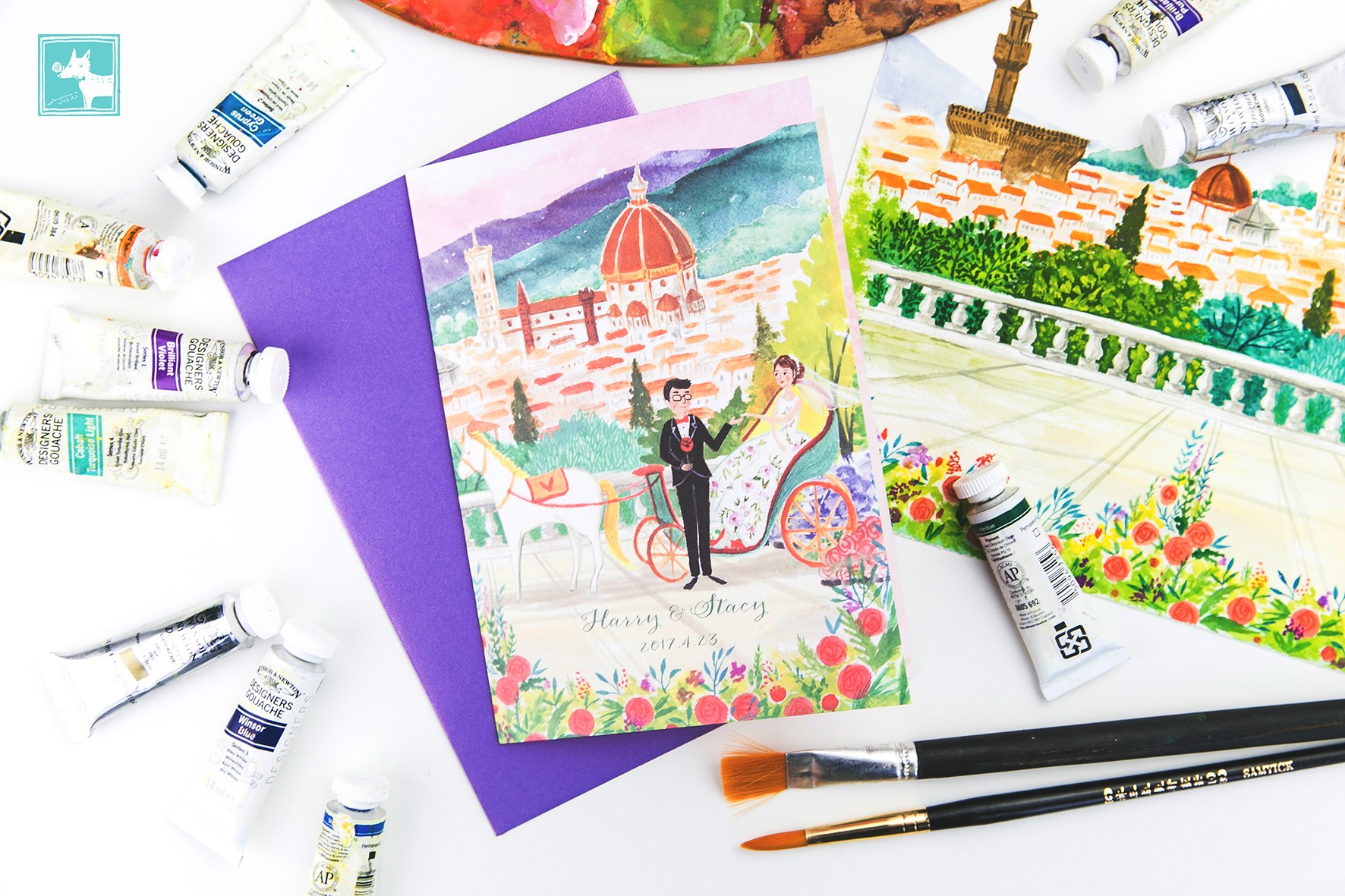 新郎和新娘一起去義大利旅遊時,留下很多美好的回憶,除了拍了很多漂亮的照片,還買了很多漂亮的明信片。於是呢,新人希望喜帖上可以呈現義大利浪漫絕美的景色,而Jubie看到那些照片時,也覺得非常喜歡,一邊創作,也彷彿一邊享受了趟義大利之旅呢!