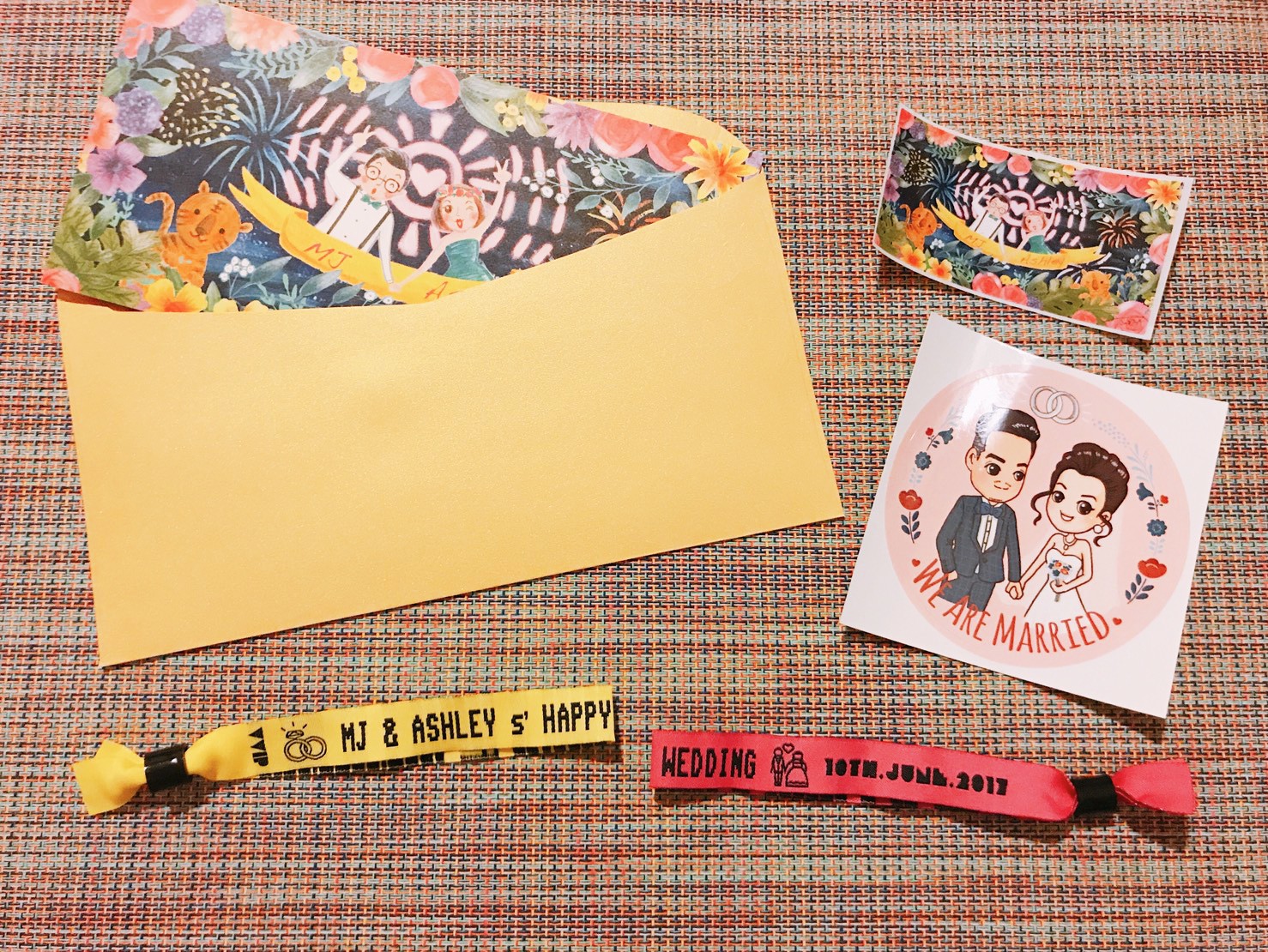 喜帖真的是我整個婚禮中最滿意的部分,由於我們的喜帖是想像參加國外電音趴收到票的感覺,所以是希望喜帖設計上顏色可以繽紛以電音趴的舞台、燈光、煙火的元素去設計,其實老實說喜帖的設計我並不是一開始就找Jubie ,是因為當時我想做一個貼紙,無意間逛網站時看到了Jubie 的粉絲團,就立馬私訊詢問,就這麼剛好當時遇到幫我設計喜帖的人完全抓不到我要的風格,再怎麼改可能都不會是我要的感覺,我立馬決定不要浪費時間直接換人,加上我腦中對Jubie的作品印象很深,立馬跟她約出來談,談論的過程中我發現我跟Jubie說我想要喜帖的感覺,她很有自信的跟我說沒問題,我心想哇這麼有自信的人我相信成果一定很棒,在第一次草稿出來時我真的差點哭出來,我每個想要有的元素全部都在上面,包括我自己覺得可能不搭的兩隻生肖老虎都在上面了,已經比我自己想像的更好,草稿後接下來的上色,我不誇張真的完全沒有改過Jubie 的創作,因為她完全完全抓住我要的,感覺好像穿透我的心一樣哈哈哈哈。