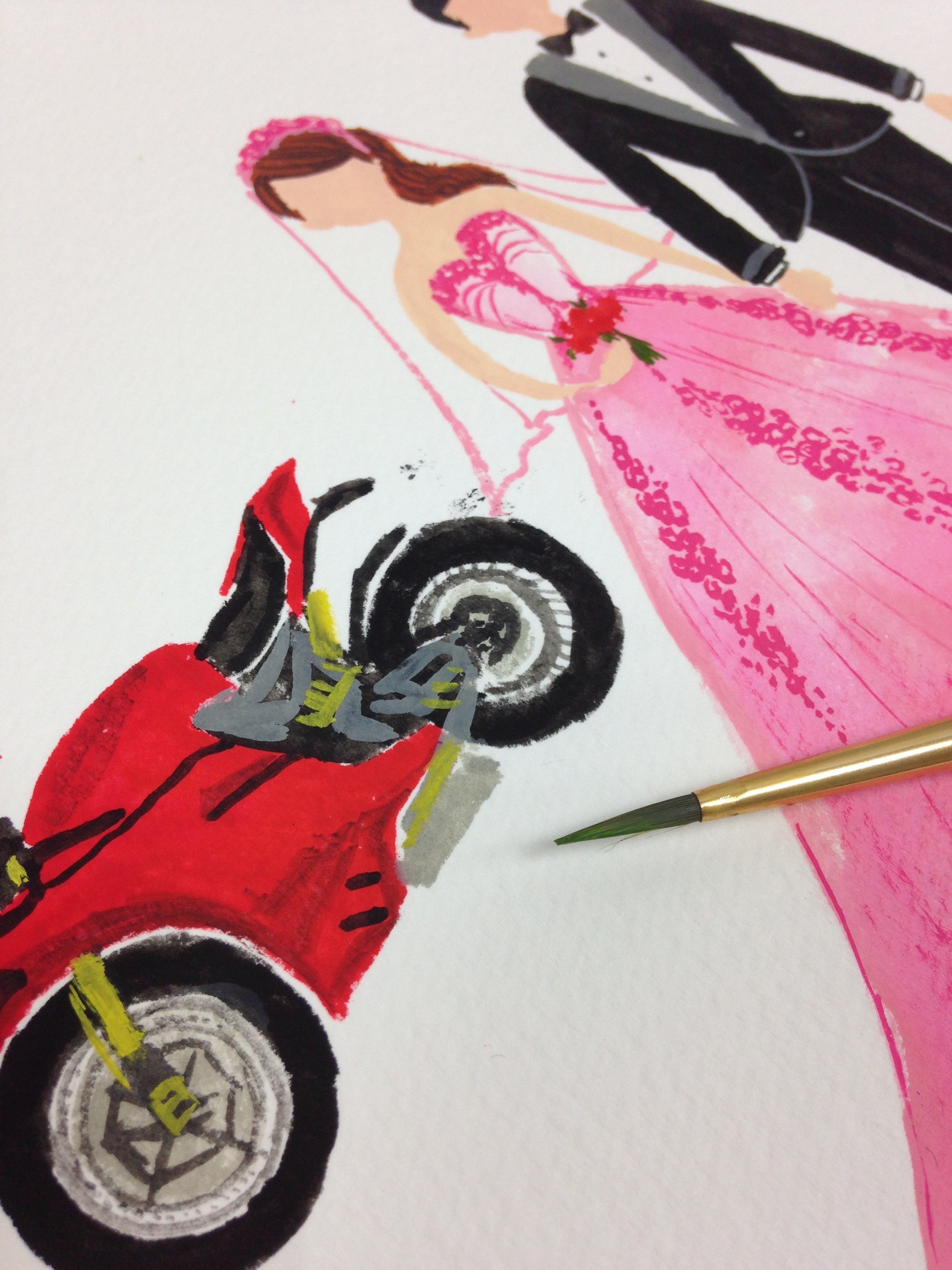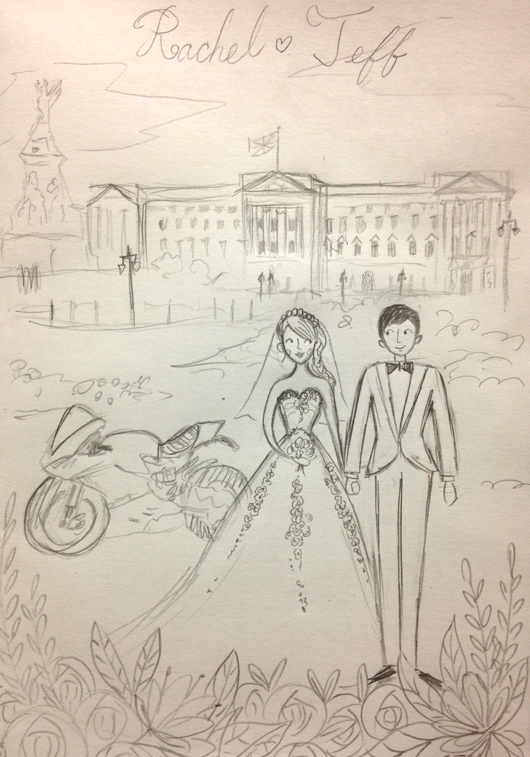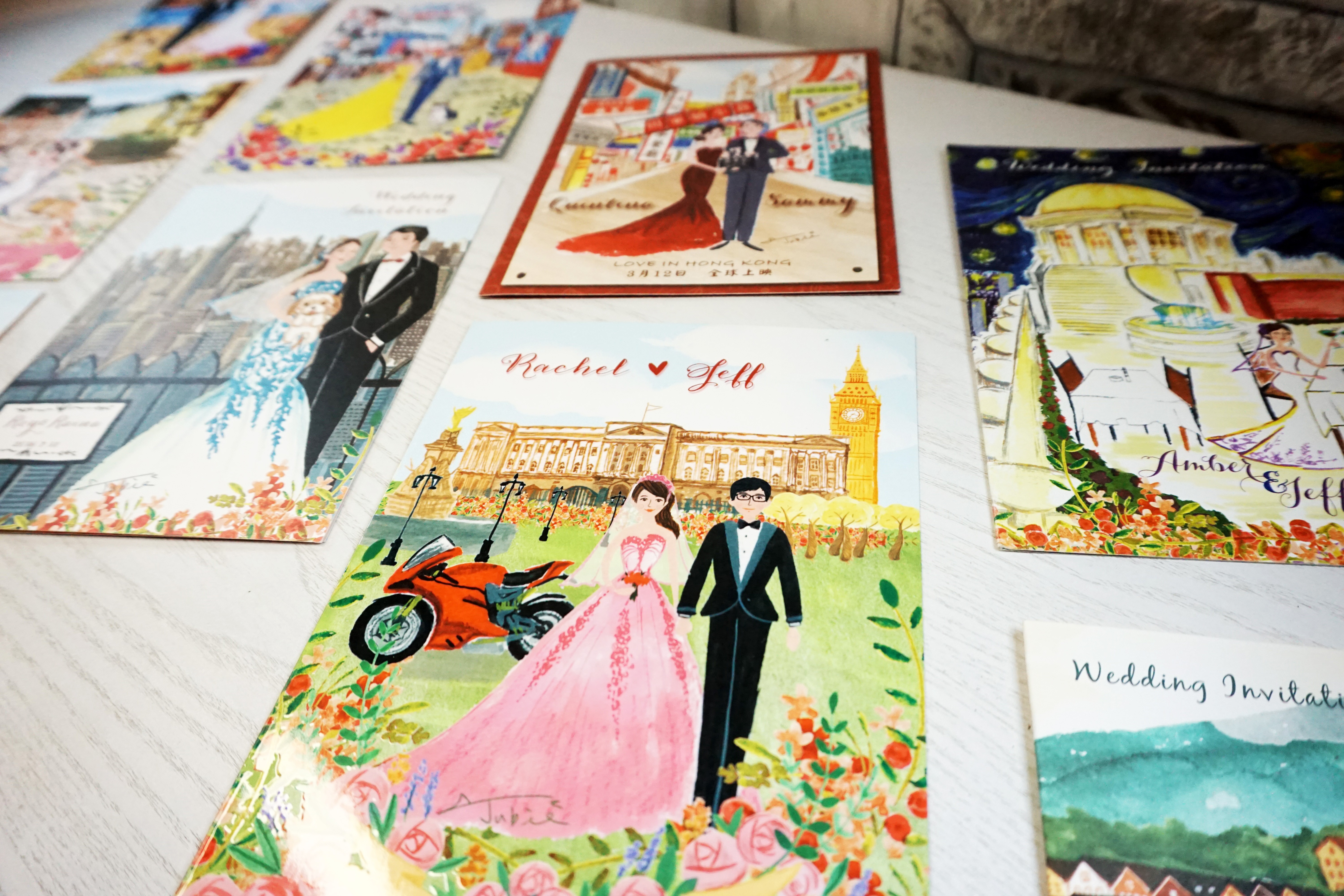 Rachel和Jeff是在婚紗展上找到Jubie的,兩人當下就決定要找Jubie製作!對於當時第一次參展的我來說,真的是莫大的鼓勵。她們是一對親切又可愛的新人,而且給予我滿滿的尊重和鼓勵!草圖製作過程中非常順利,從乾淨的筆觸就可以知道幾乎沒有任何修改,因為在溝通導論的時候就已經有了很好的默契,因此馬上就進入了上色階段啦!