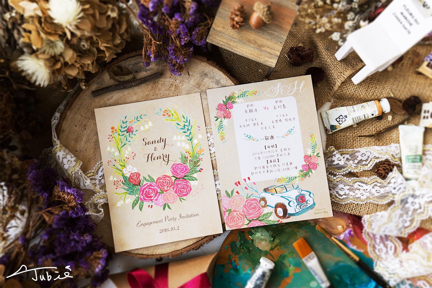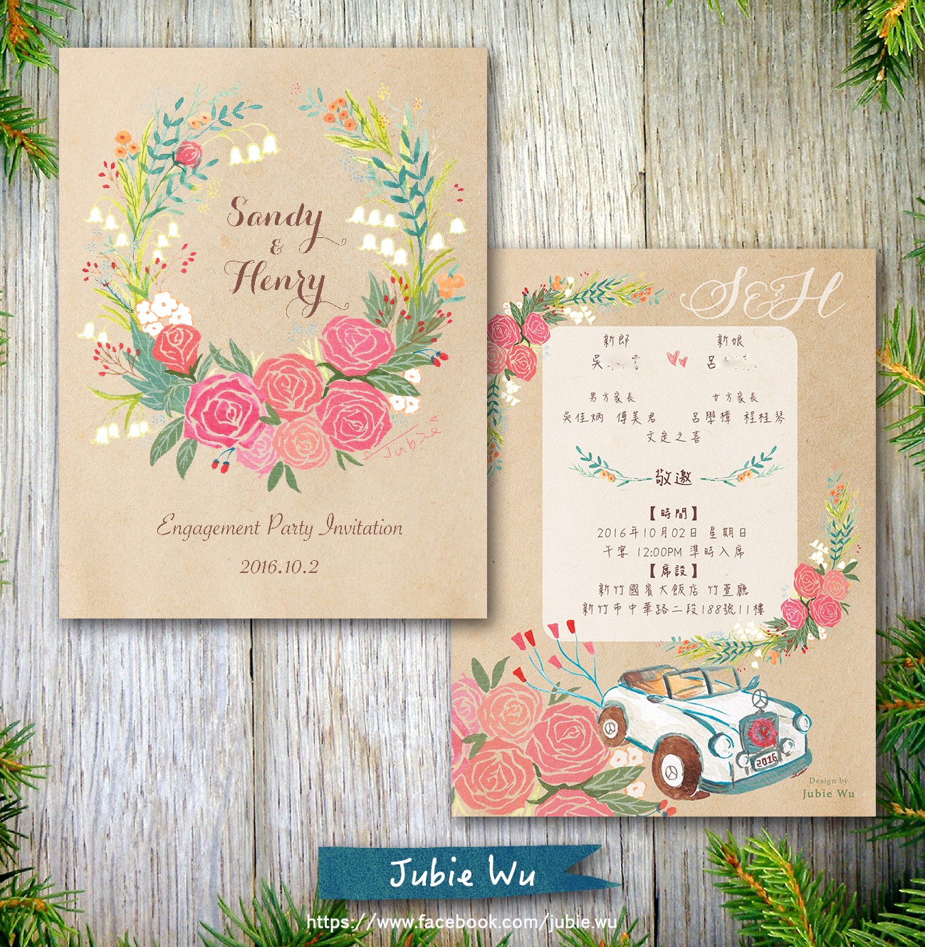 當初在接洽的時候,新娘顯然對花朵情有獨鍾,希望喜帖的主視覺能採用優雅燦放的花圈。因此Jubie繪製了粉色牡丹、英國玫瑰、鈴蘭花,配色上選用亮眼的粉色、一點白色、一點深紅色果實、一點咖啡金,綠色的葉子延伸花環的感覺。一旁帥氣而高貴的古董車與花相襯,營造典雅高貴的氣息。牡丹和玫瑰的搭配,簡約的幸福卻有雍容華貴的氣度,隱約還記得,鈴蘭花語是「幸福歸來」,畫著畫著,花朵們的祝福一朵一朵,在筆尖綻放。