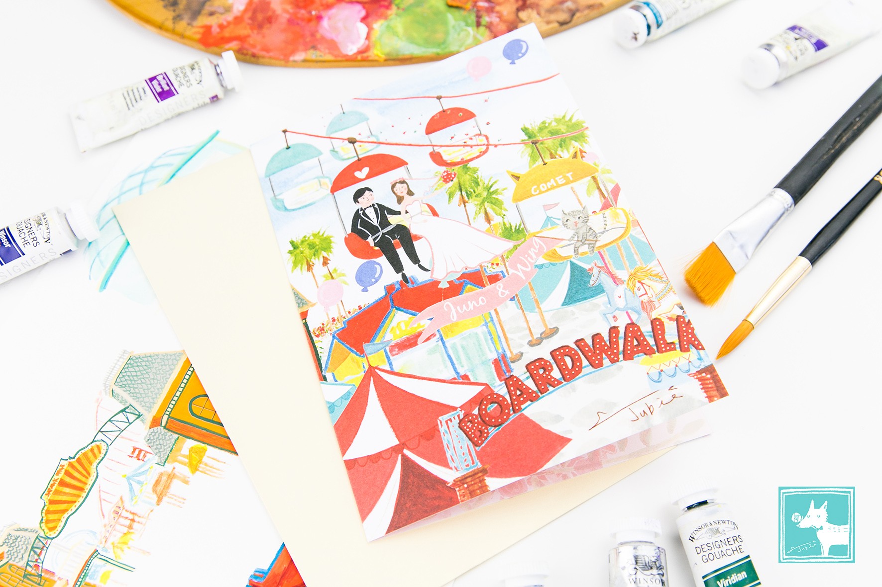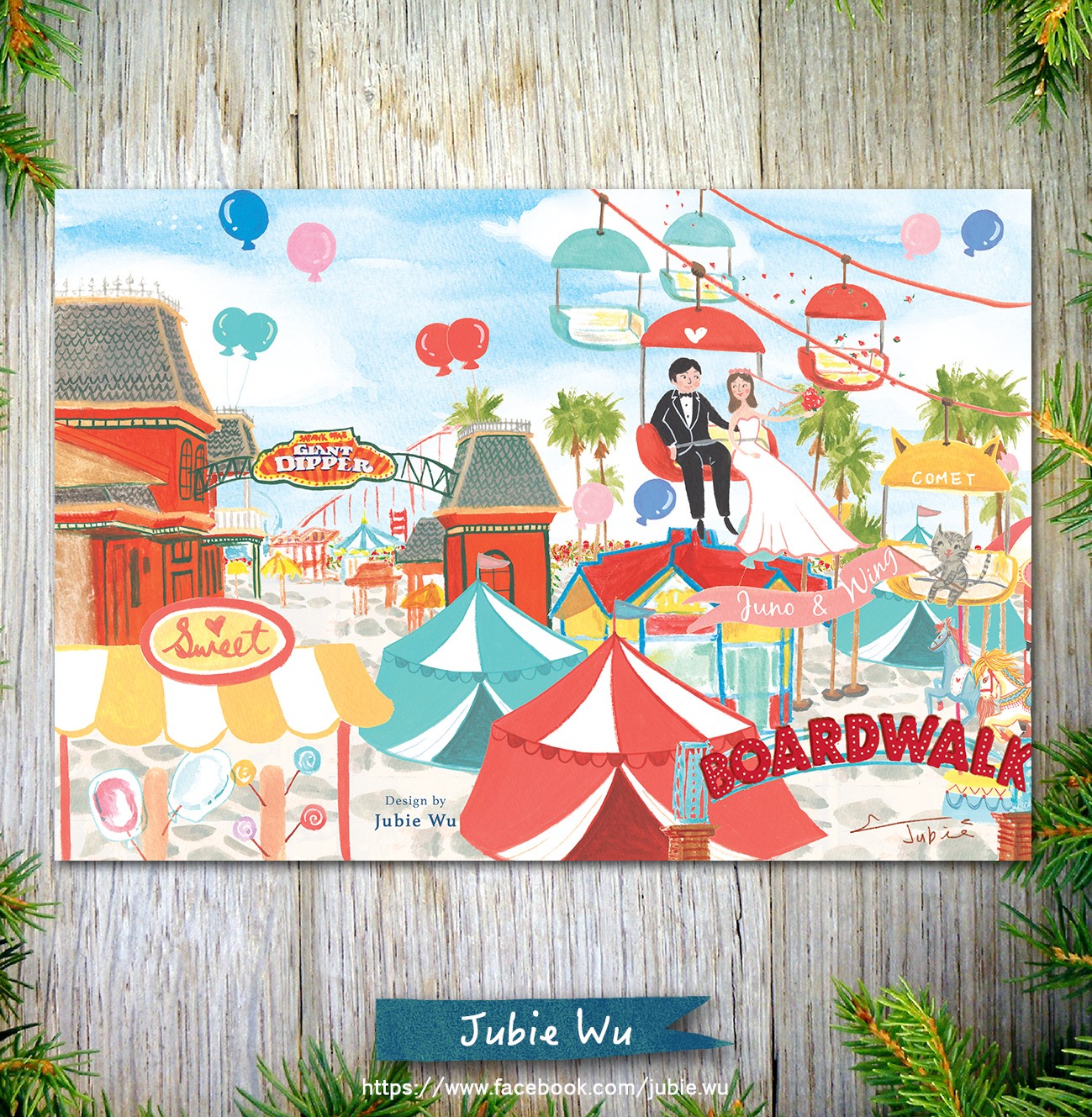 這對新人是住在美國的香港人,Jubie非常榮幸能為這對小夫妻繪製他們的愛情記憶。在他們的印象中,空中纜車和椰子樹是這個海灘遊樂園的特色,而Jubie家裡的貓咪Comet搖著寫著兩人名字的幸福旗幟,可愛的模樣也讓新人非常喜愛!最讓Jubie人感動的是:兩人在婚前一年多以前就已經下訂了。儘管新人在國外,不像台灣客戶可以很直接聯繫,但是雙方溝通過程非常順利。尤其在忙碌的籌備婚禮期中,用心的新人還能將資料準備得十分充足,而且相當尊重專業,從~頭~到~尾都沒有改動過Jubie的設計。有這樣高度的信任感,合作過程當然非常愉快囉,所以讓Jubie在作畫時一直保持雀躍的好心情呢!