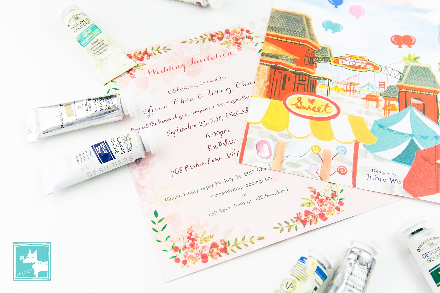 Our wedding invitation card was designed by Jubie Wu and we couldn’t be happier with how amazingly beautiful the card is! With Jubie’s creative expertise, she will guide you through the design process of creating the unique and perfect invitation with every single detail of how it will match with your own style, selection of font types, theme colors, and envelope layouts. Jubie is easy to work with and she will keep in touch with you every step of the way; from the initial consultation, through the invitation design, the many proof reviews, and down to the final print outs. The shipping was very fast that it only took one week to be arrived.