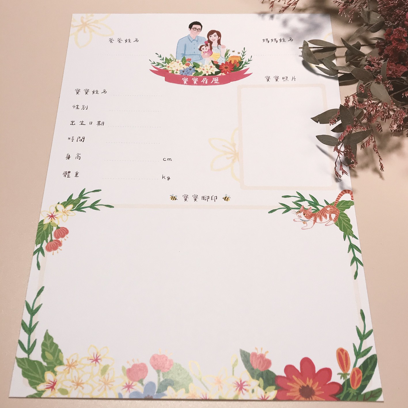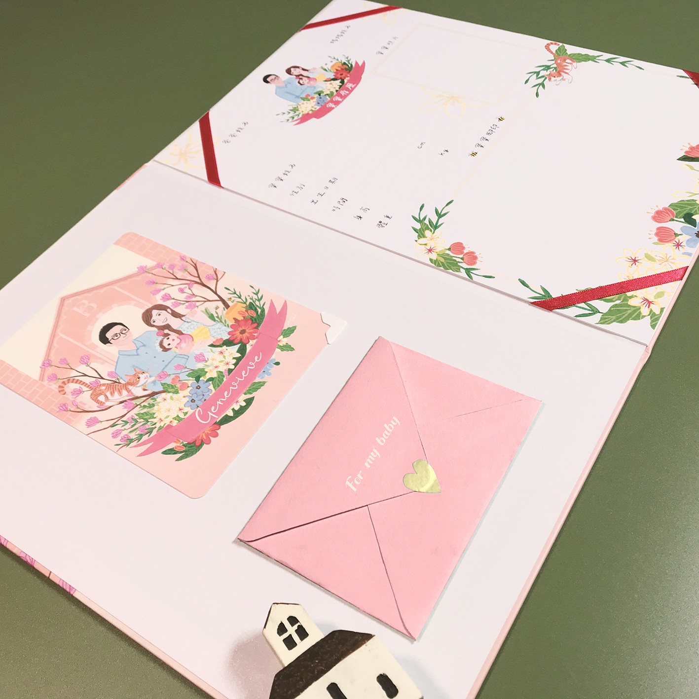 質感精美的書約夾封面,印上彌月卡同款設計,內頁一邊夾著製作好的彌月卡以及可愛的小信封,讓爸爸媽媽可以裝入寫給寶寶的信;另一邊則是寶寶出生的全記錄,包含生日、身高、體重,還可以黏貼寶寶照片,以及收藏可愛的小腳印!