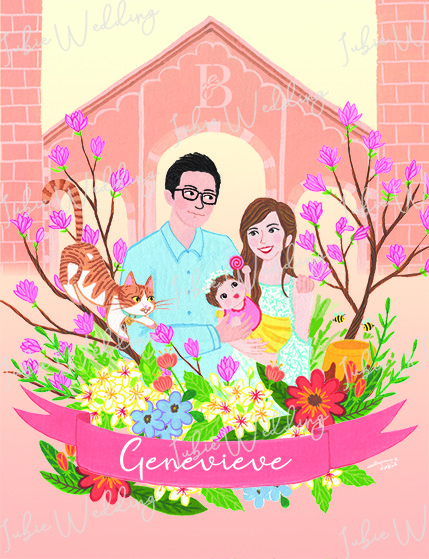 以兩人母校的優美建築和代表花-木蘭花為背景,卡片正反面都有學校的吉祥物-熊和代表熊的蜂蜜罐,而圍繞在新人前面的繽紛花朵中,特別畫出代表女兒的油桐花,與滿含期待的新手爸媽和心愛的貓咪,一起迎接新生命的降臨。