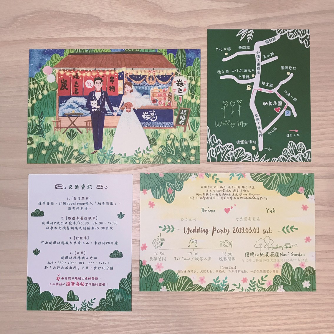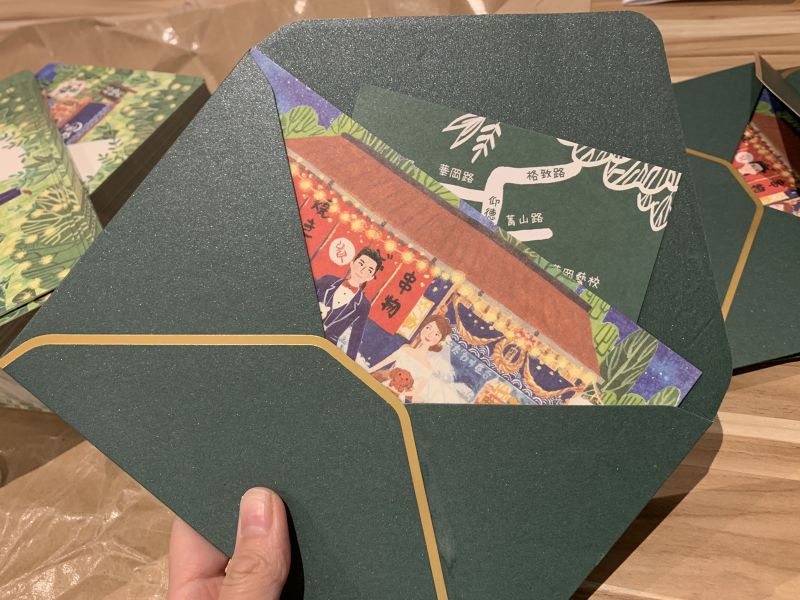 因為新人先在沖繩舉行婚禮,後在台北宴客,因此分別製作了兩款風格的喜帖,一款是沖繩海灘風,一款是森林大地風,兩款風格完美融合兩人一起經營的串燒小店、明星商品和心愛的寵物,滿足新人的所有想像。