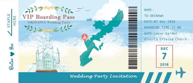 沖繩款的喜帖我們用機票的概念,讓大家有一種即將出發的想像!
