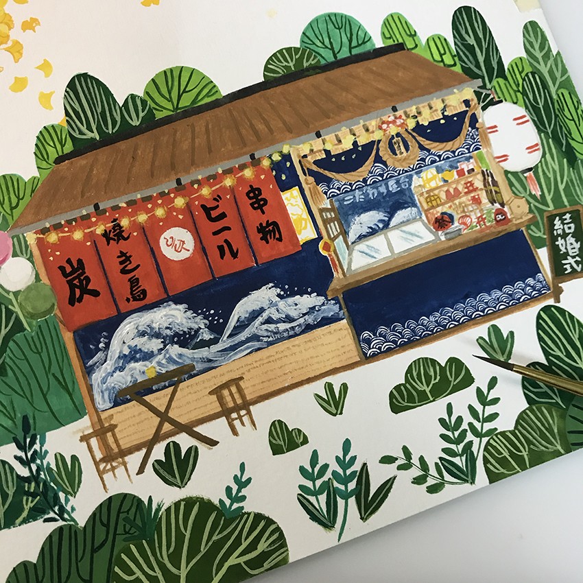 走進一片草綠色森林,映入眼簾的是一間閃亮亮的串燒小店,在Jubie的畫筆下,彷彿能聞到空氣中飄著的,幸福的香氣。
