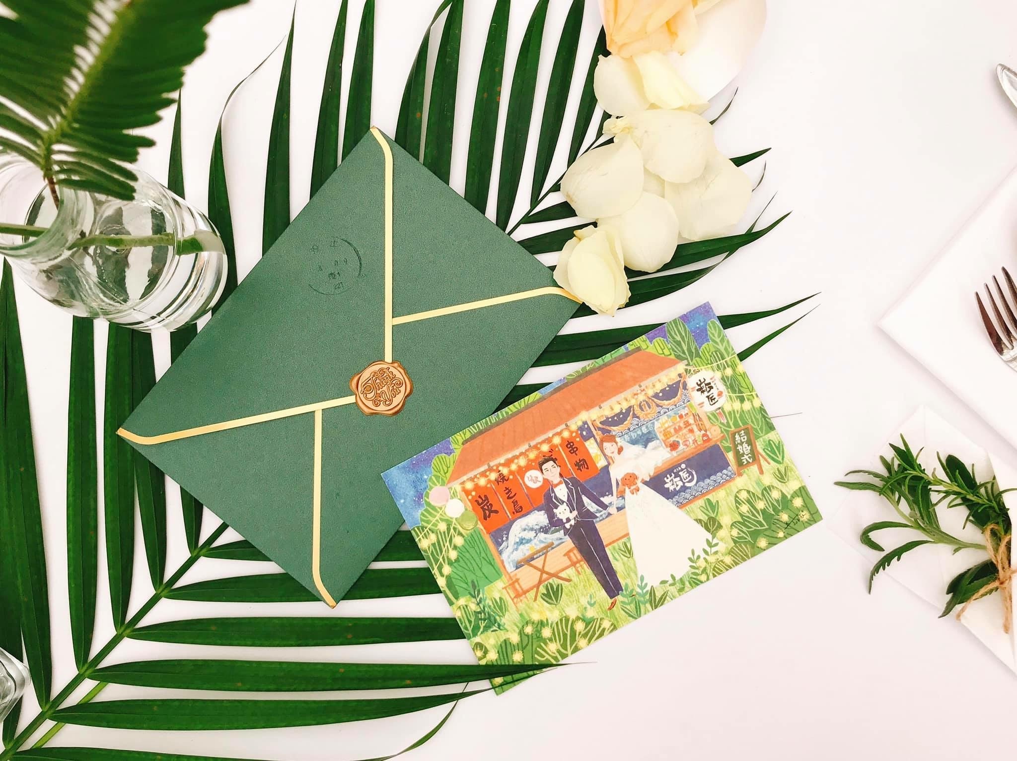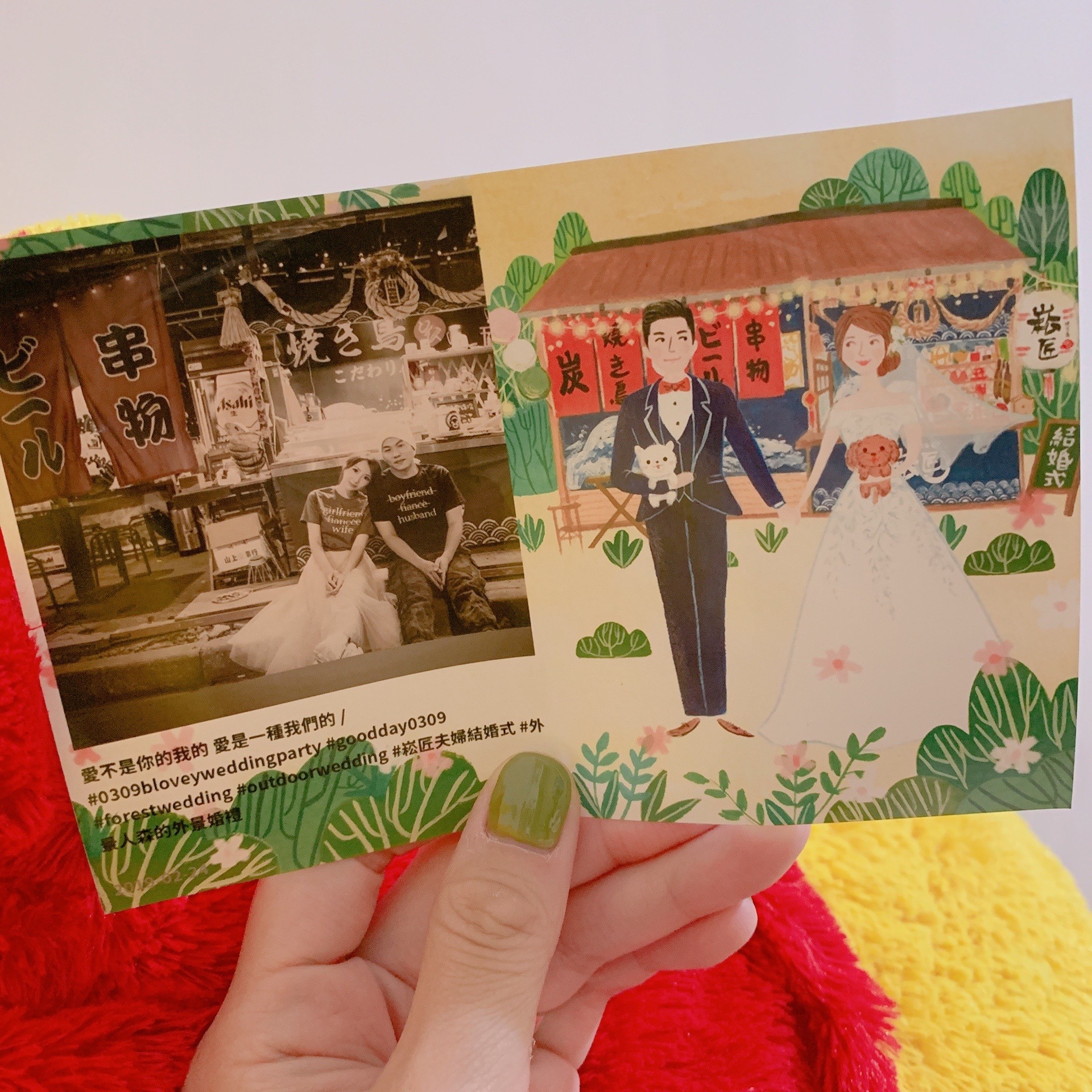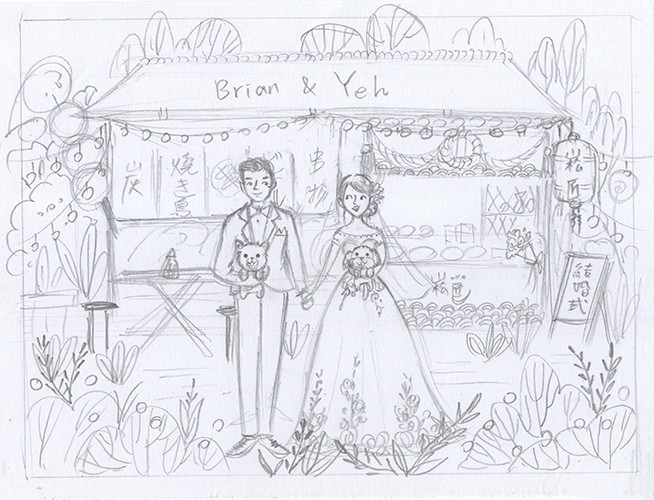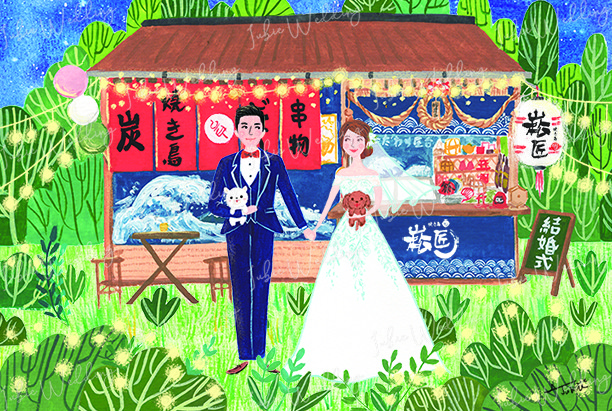 圍繞在串燒店旁的綠色森林、黃澄澄的燈泡,帶出一股清新~串燒店面的各個小細節還有主打餐點都一一描繪,而牽著手的新人默契的相視而笑,溫暖的畫筆呈現幸福的氛圍,讓新人收到後說:嗯,這是「我們的」喜帖!