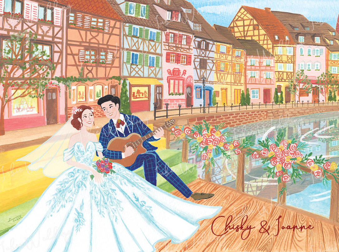 這是一幅充滿色彩又溫暖夢幻的喜帖,在畫畫的時候,空氣中彷彿飄著甜甜的味道,一筆一筆,細細塗抹出新人夢想的畫面,這就是幸福的模樣。