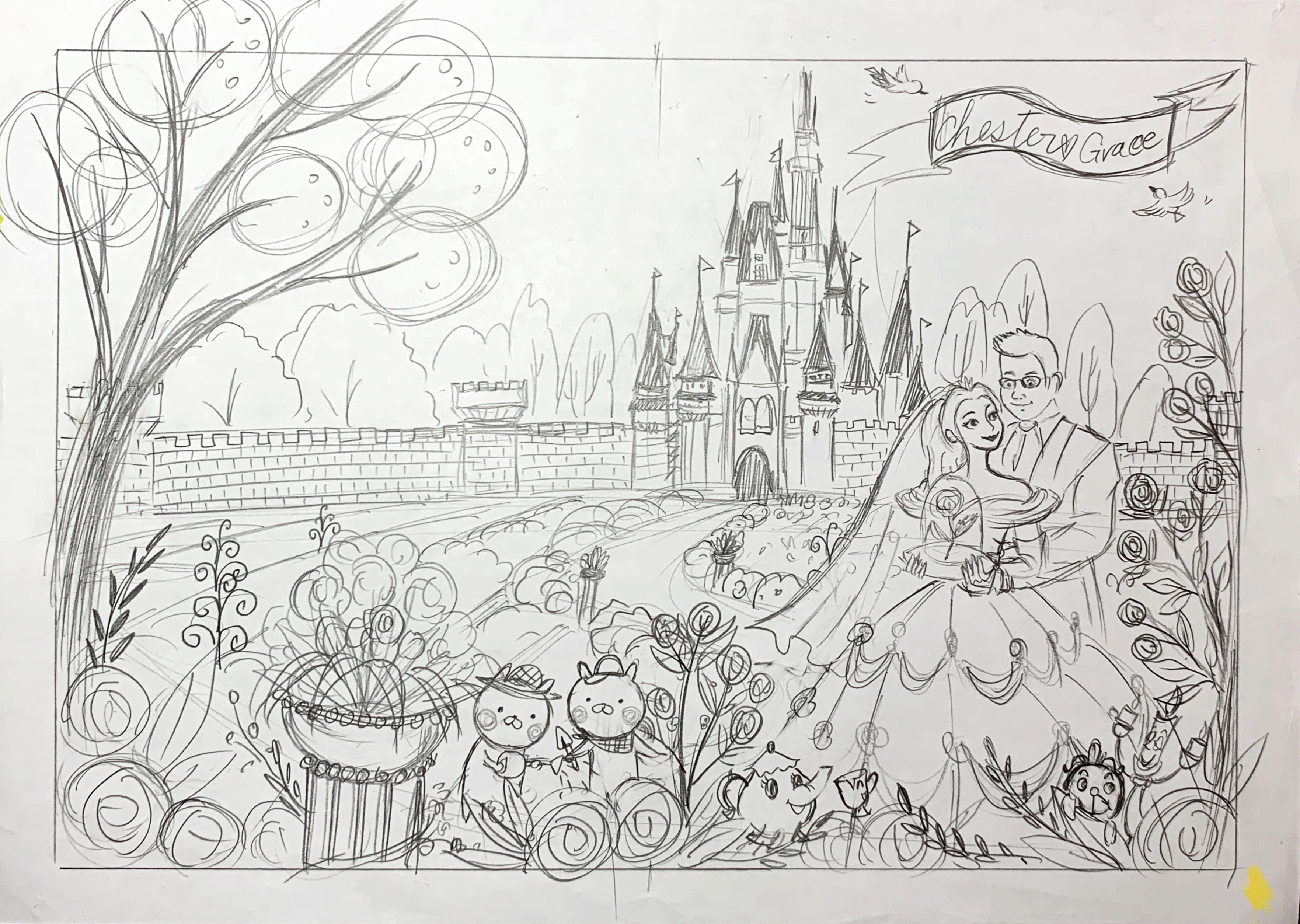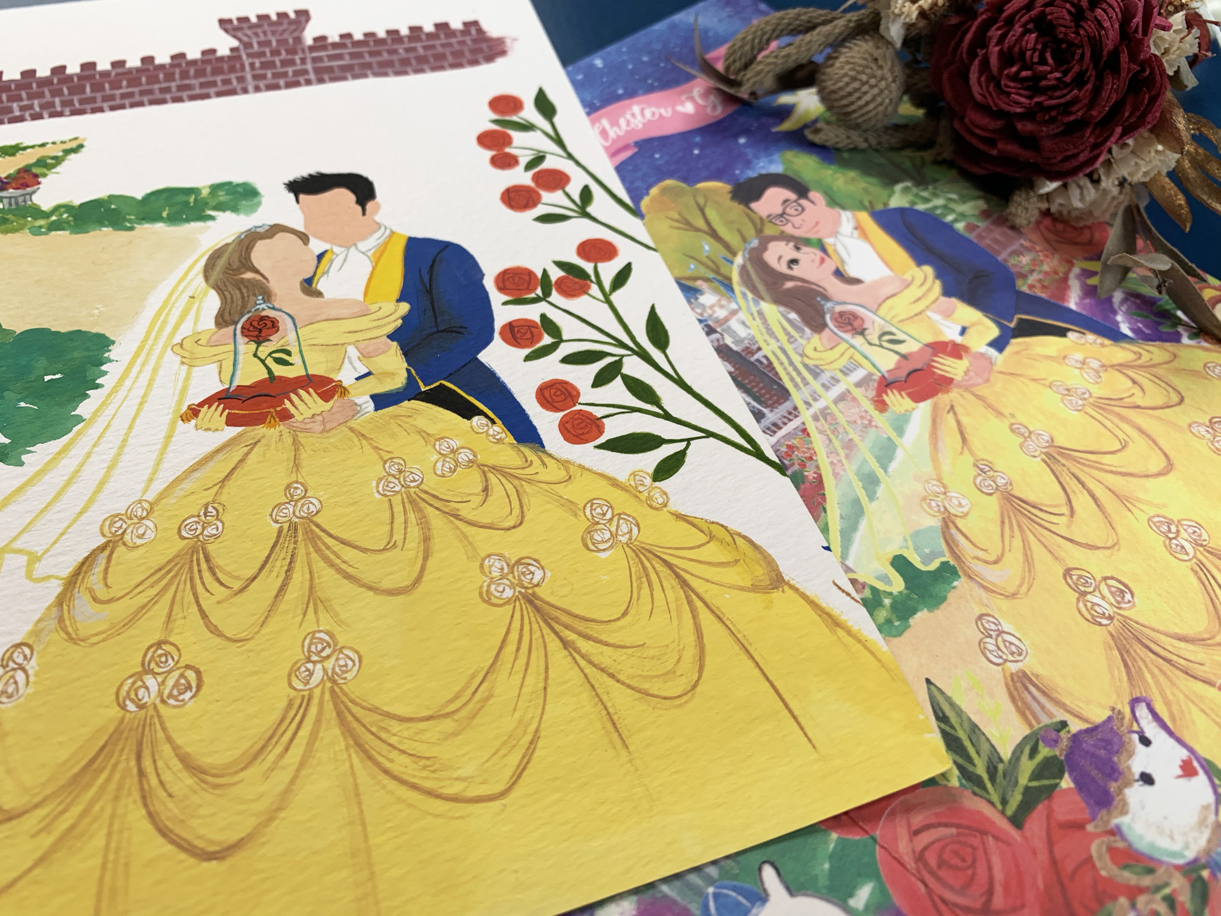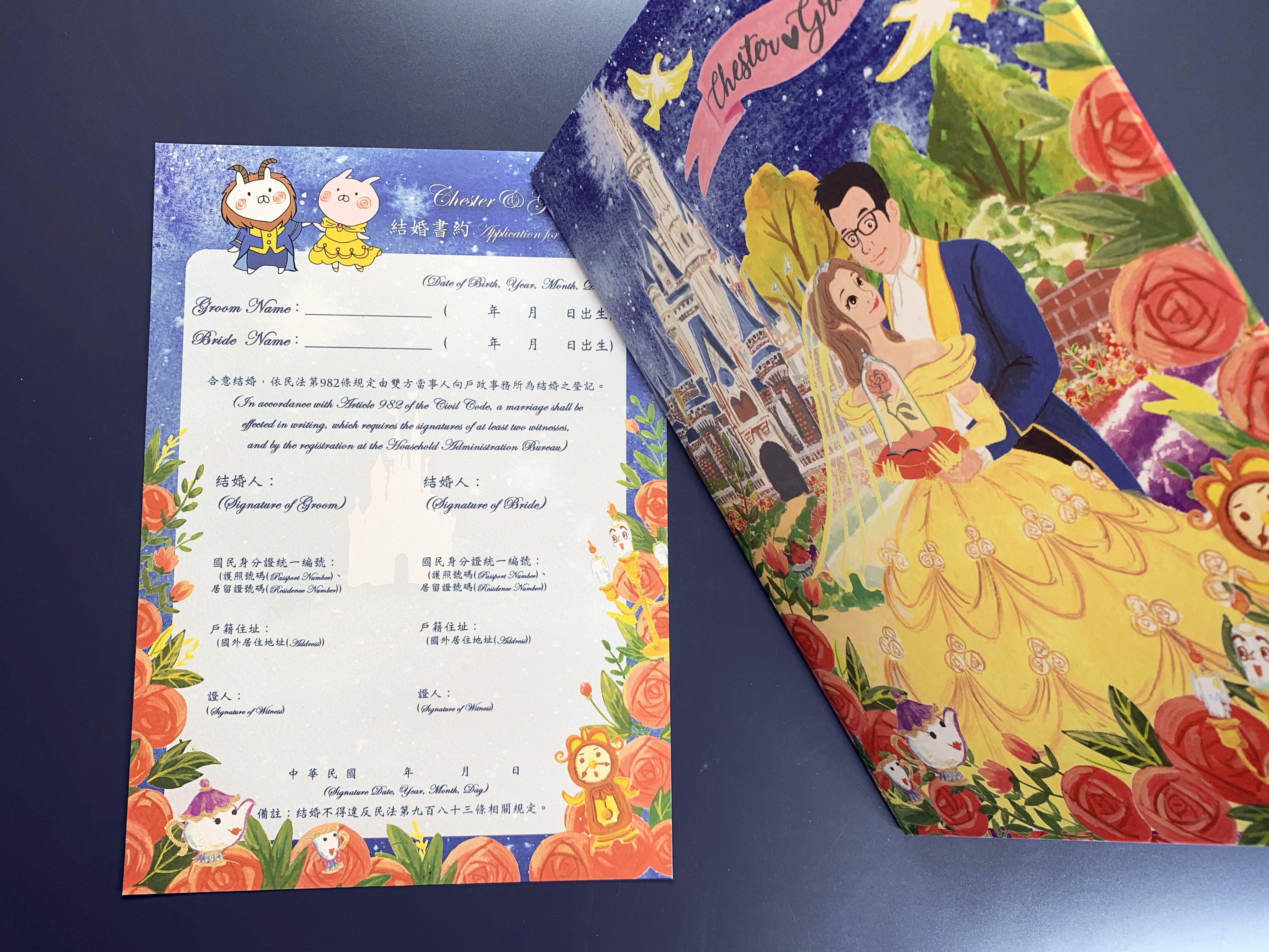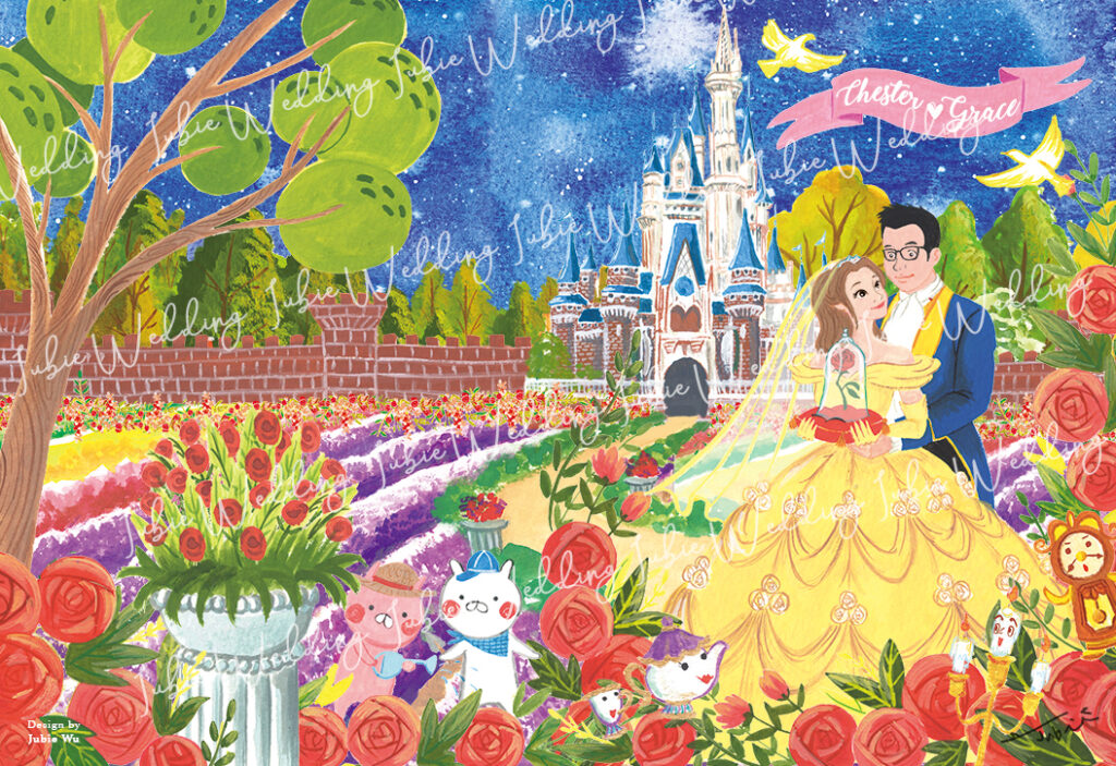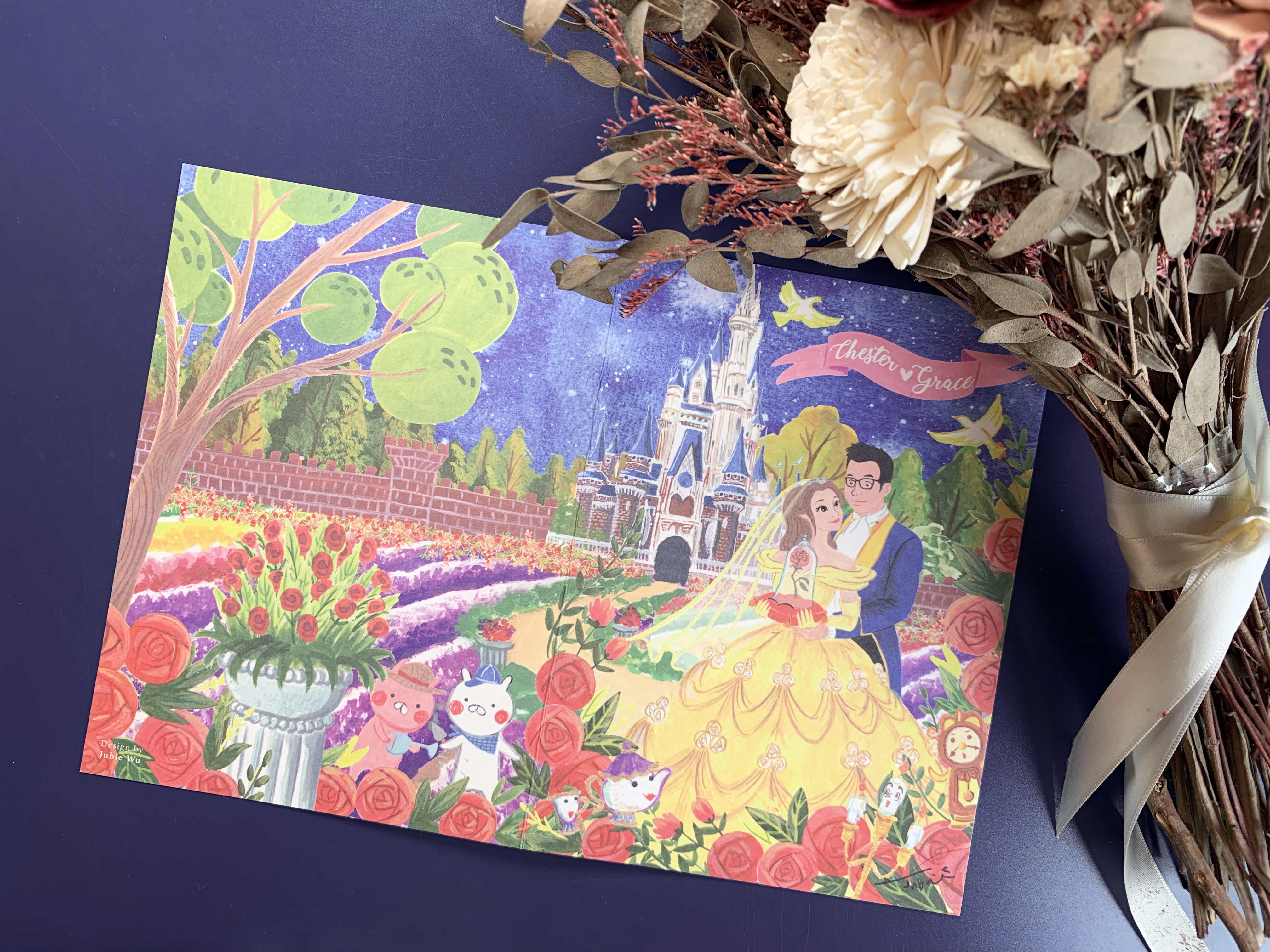 這是我們準備最久的一項東西, 歷時一年才有完成品呈現, Sacree Days是日本一家專門做Disney風格似顏繪婚禮迎賓的廠商, 我在2011年到日本留學時偶然在網路上看到一篇關於他們的報導,那時就決定若將來結婚必定請他們來幫我做一幅, 2017/4我們決定結婚後, 我第一件事情就是聯繫他們並歷時7個月, 在2017/11才拿到草圖與完成圖稿, 拿到之後我便開始尋找能將他轉為喜帖的廠商, 就在此時找到了與之風格相當融合的Jubie Illustration, Jubie是以水彩作畫的喜帖畫家, 他的作品不乏有相當多童話的元素, 所以我立刻在FB上與她聯絡, 聽完了我的想法她也立刻答應了這份特別的工作, 將Sacree Days的草圖以水彩方式重新繪製並搭上她最擅長的夢幻花園及城堡, 同時我們也將成品mail給了Sacree Days並得到了繪師大力的讚賞, 真是相當的開心,能完成我們心目中完美的喜帖真的得好好感謝一直被我摧殘的兩位畫家, 誠にありがとうございました。我們另外還有請Jubie幫我們把圖做成書約呢!!