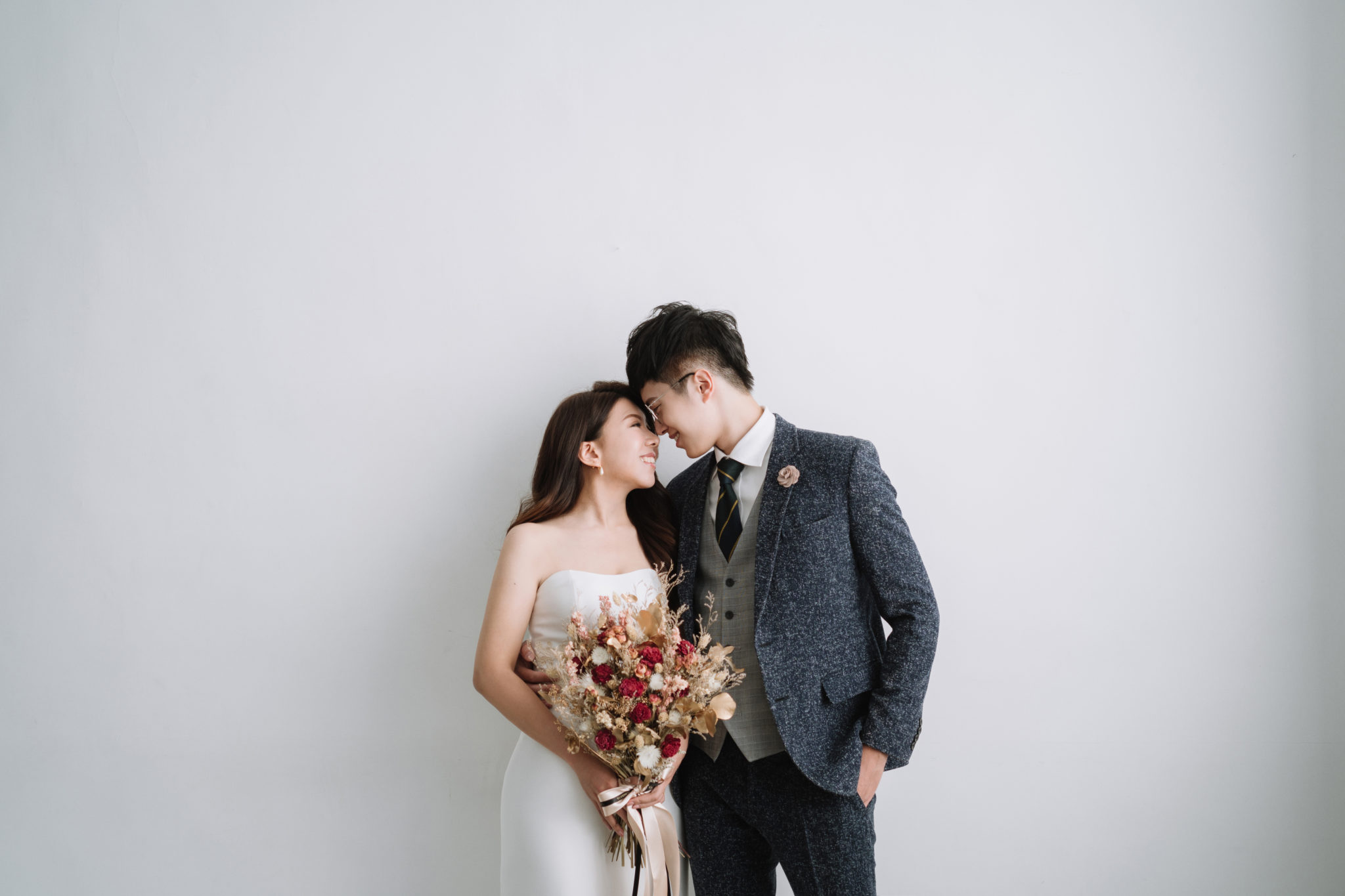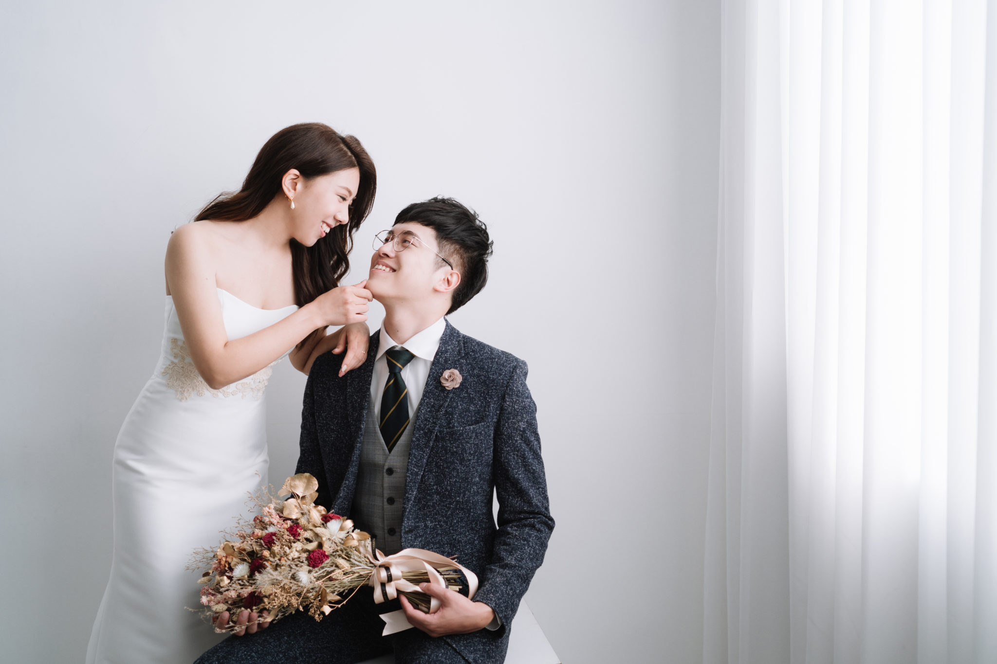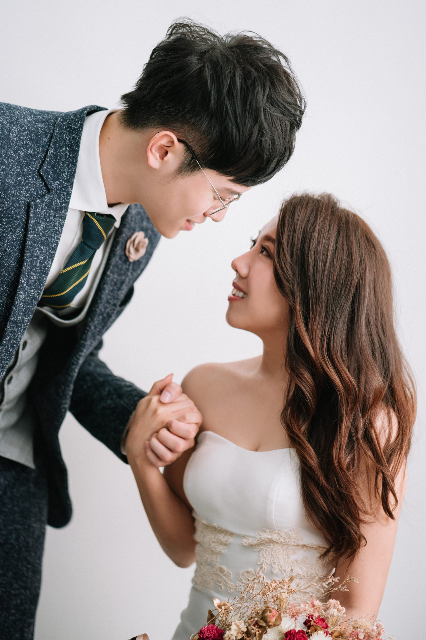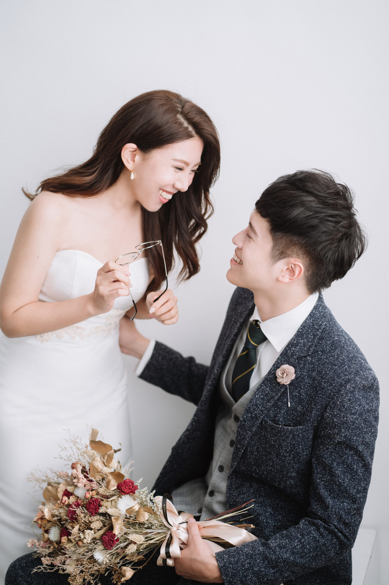 配合我想要的典雅風格,海哥找到了簡約風攝影棚,搭配上T.J HANAYA 緹緁花屋乾燥捧花畫龍點睛。我只能說海哥很懂我!那就先來看看海哥鏡頭下的我們吧~