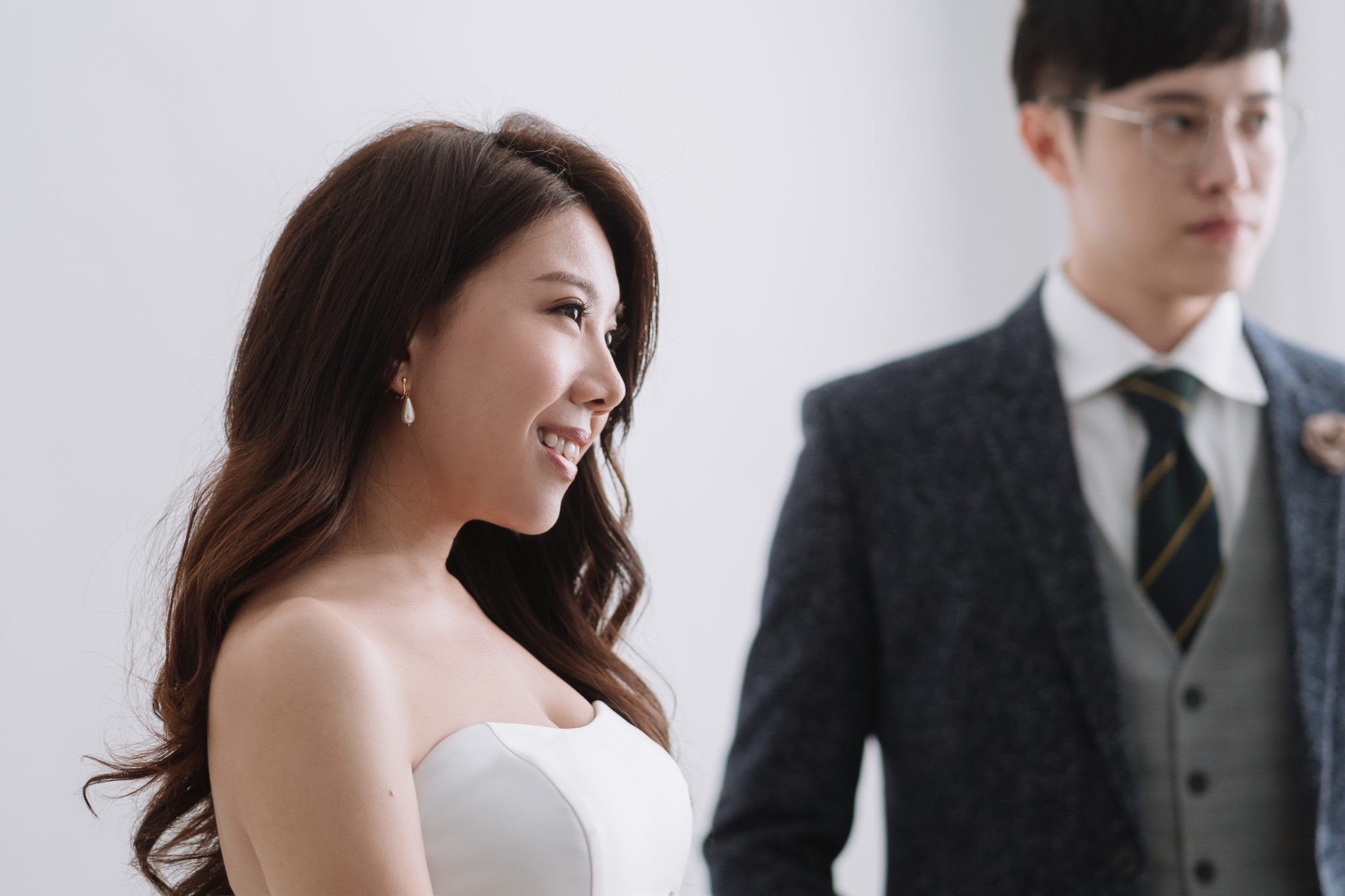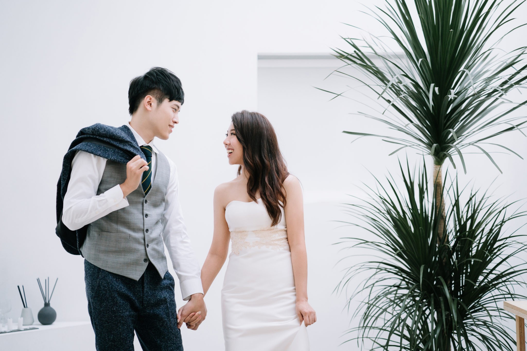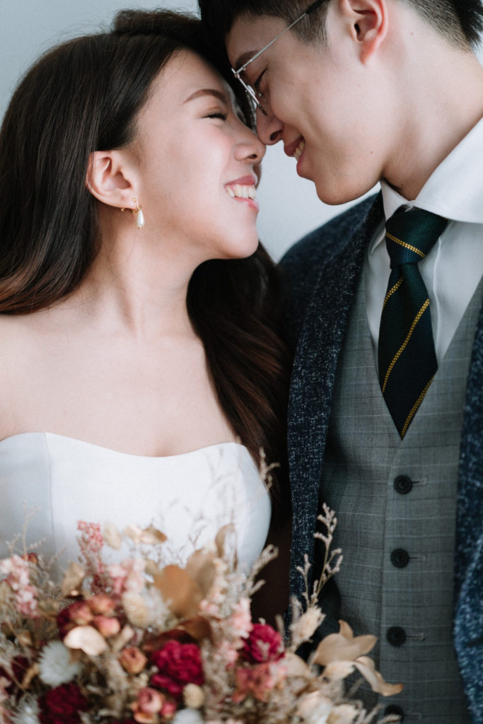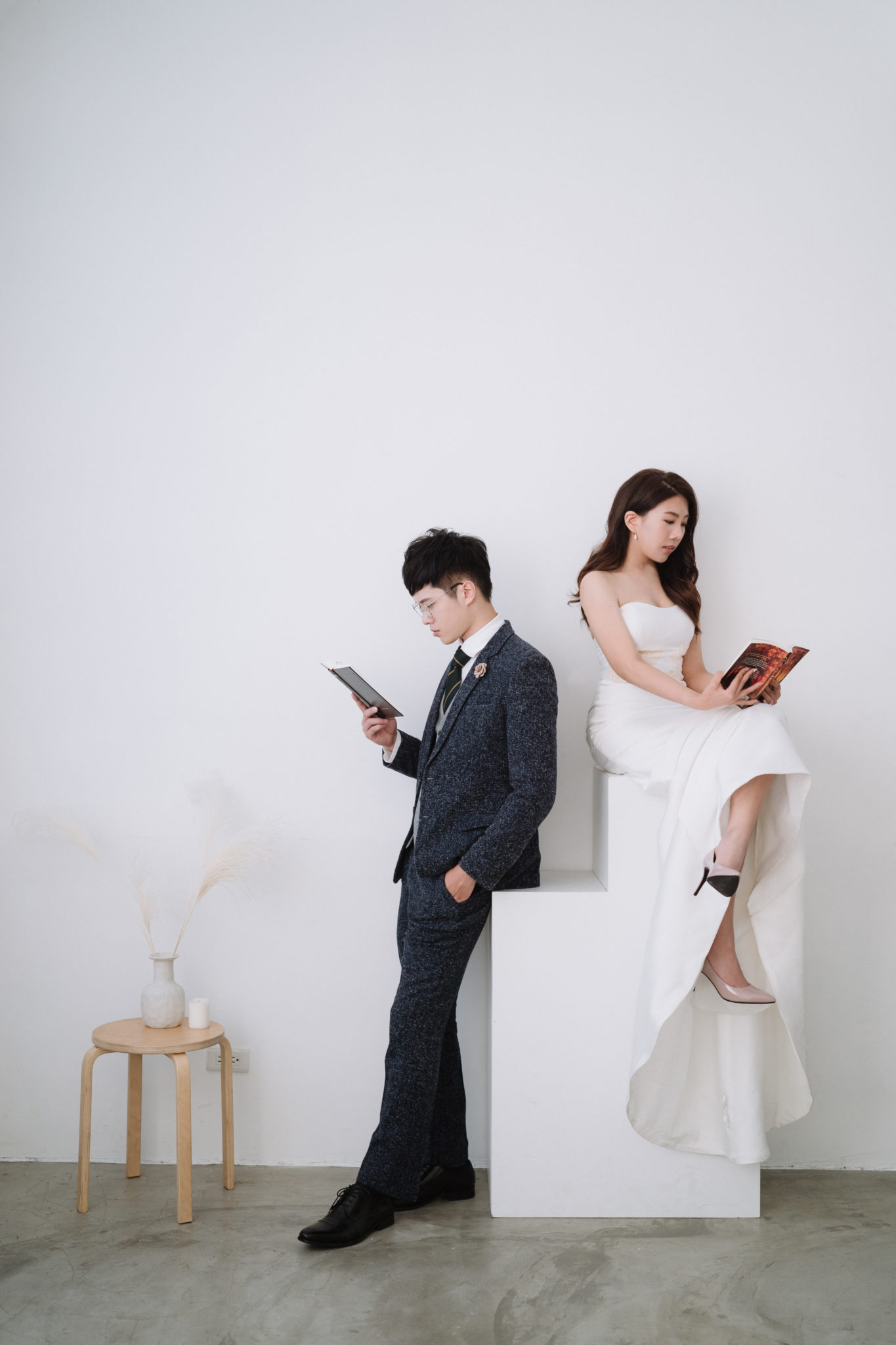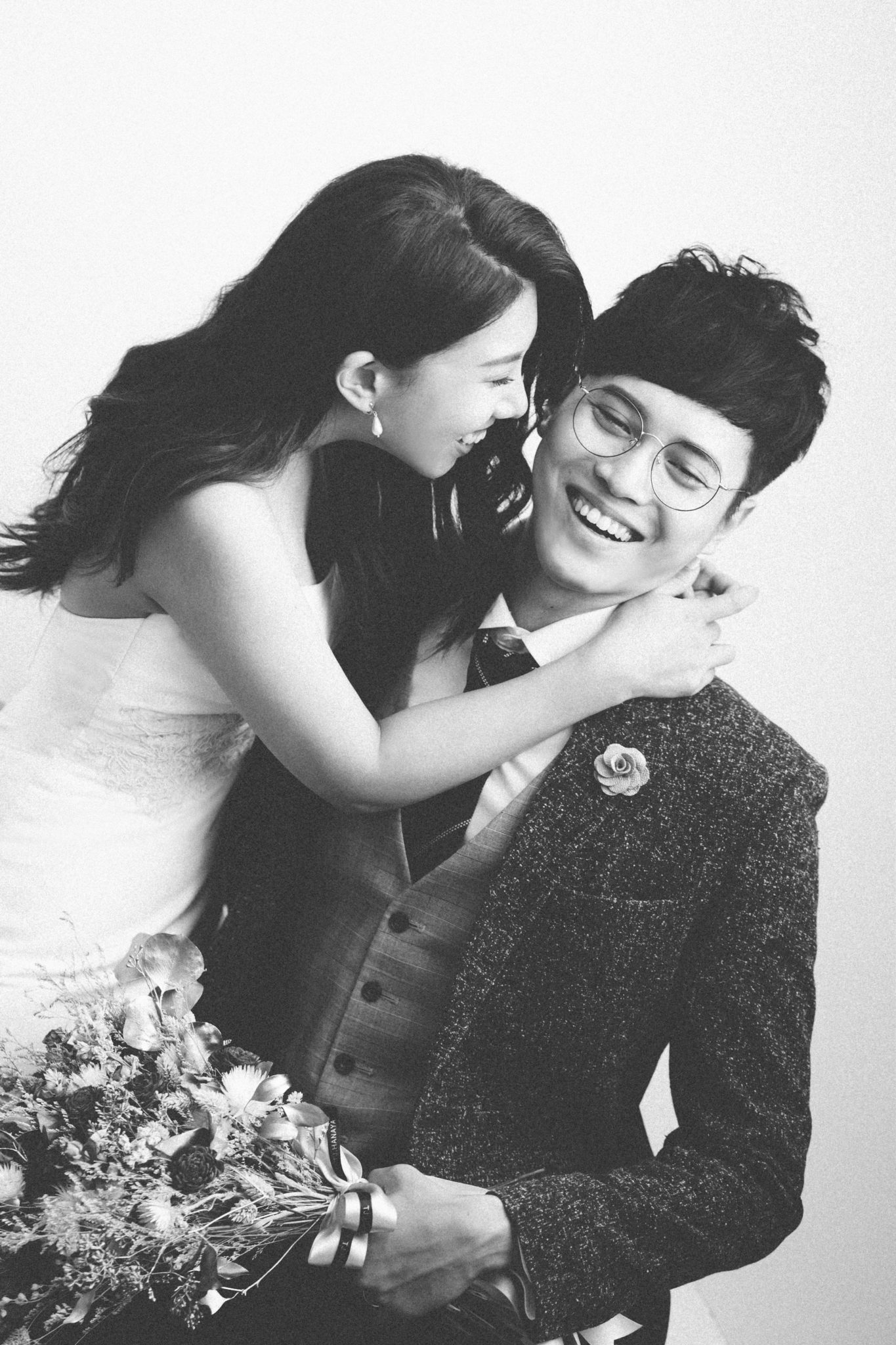 配合我想要的典雅風格,海哥找到了簡約風攝影棚,搭配上T.J HANAYA 緹緁花屋乾燥捧花畫龍點睛。我只能說海哥很懂我!那就先來看看海哥鏡頭下的我們吧~