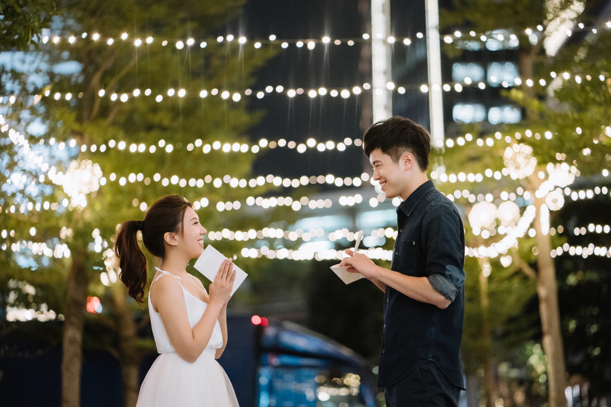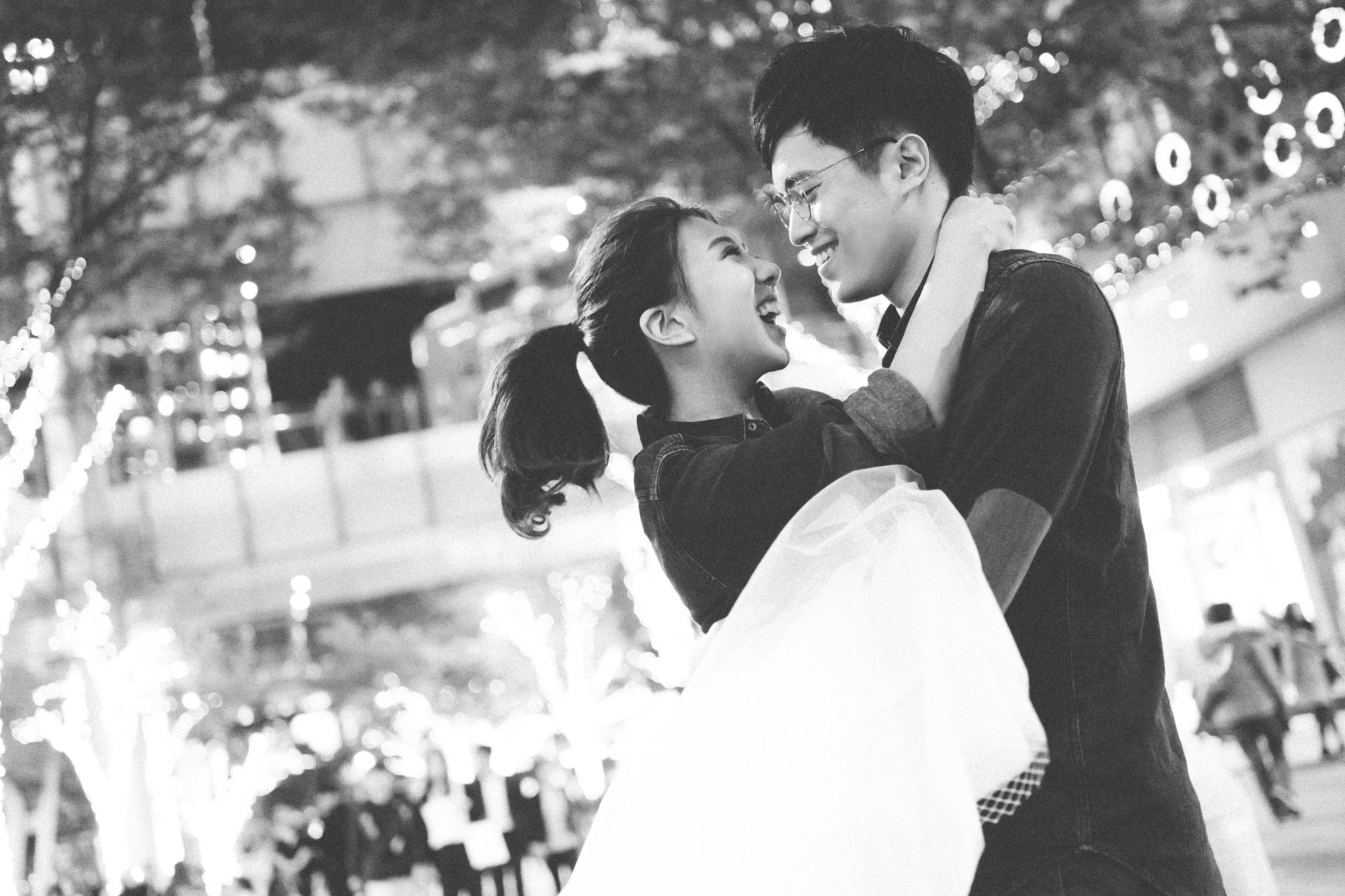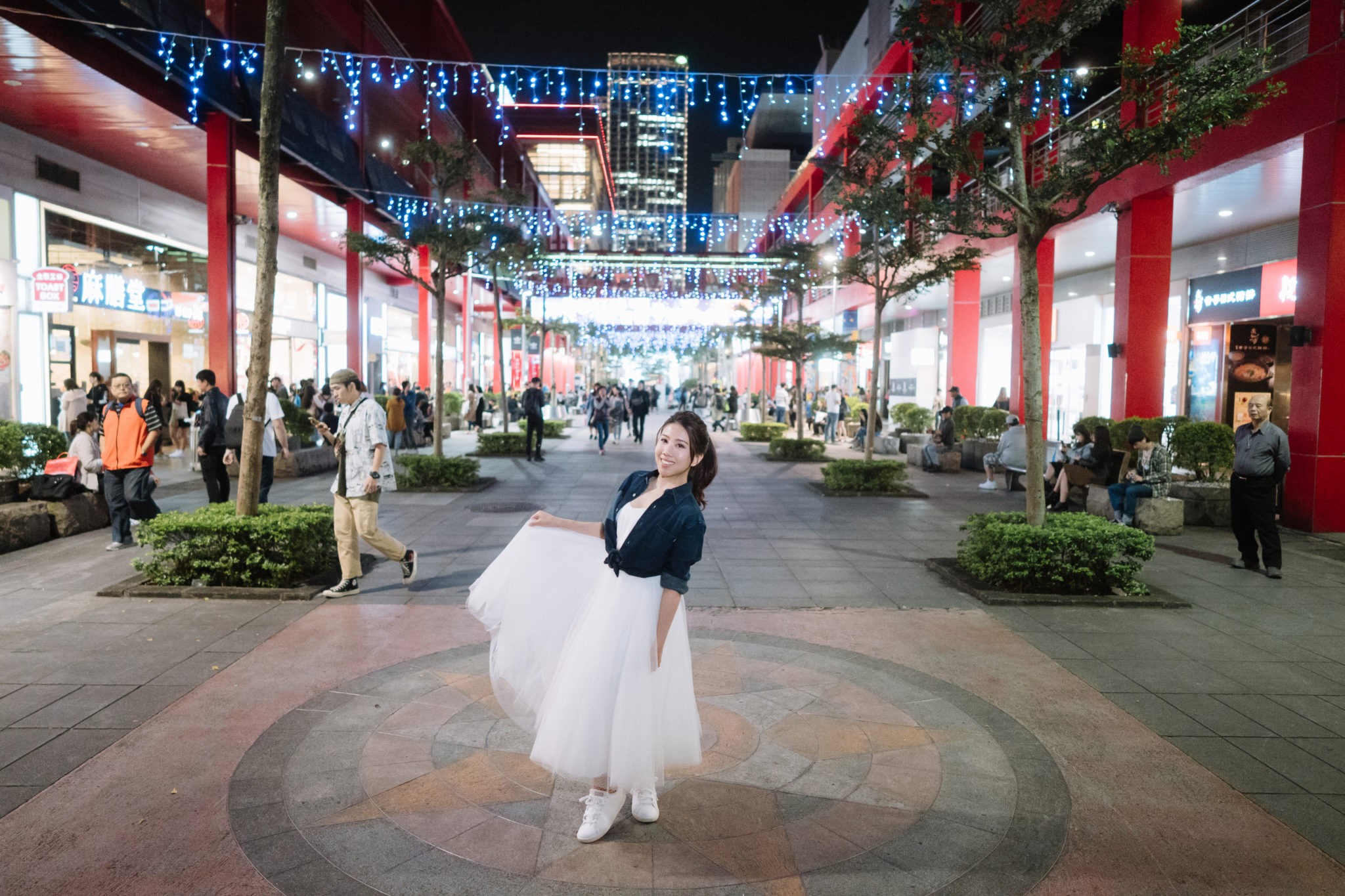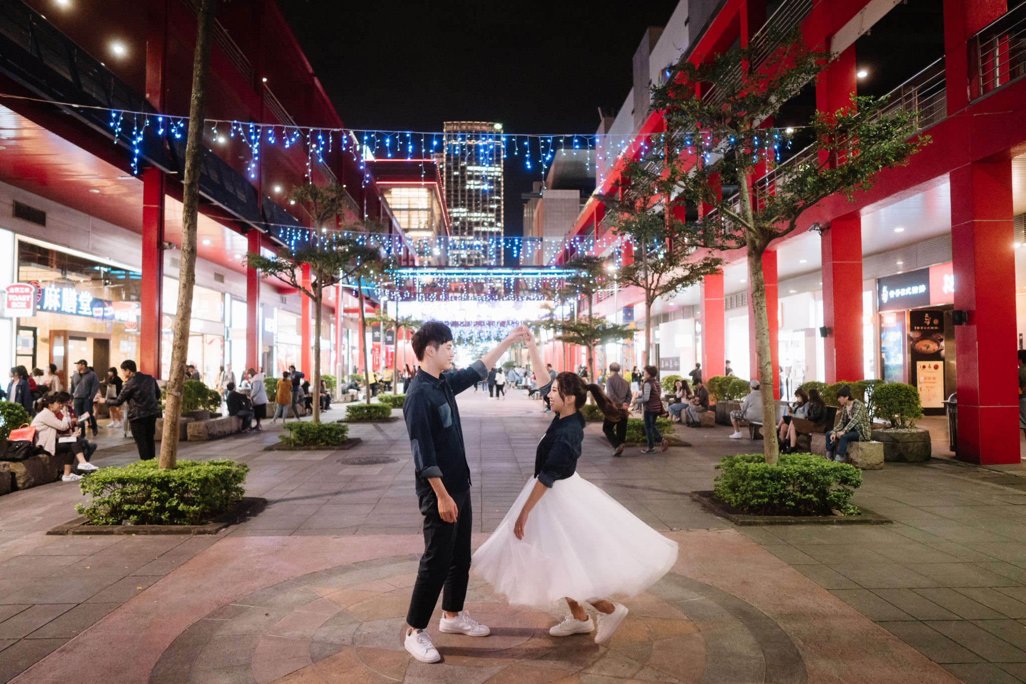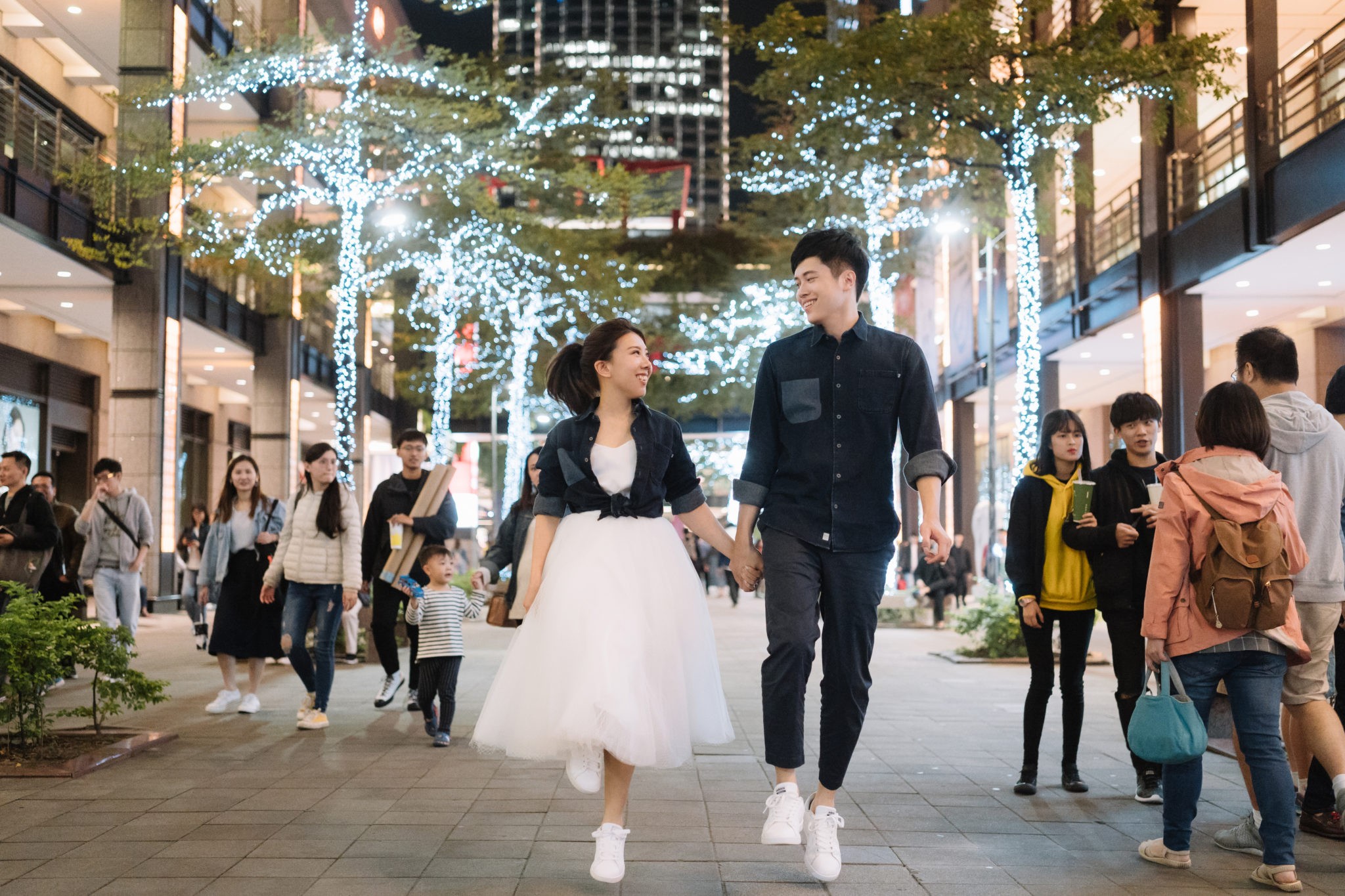 那到底要拍白天還是晚上呢?幸運的是在我們開拍前兩天,海哥說信義區威秀影城周圍的聖誕節燈飾已經裝飾上了!於是二話不說,第二套威秀婚紗我們決定拍晚上啦!