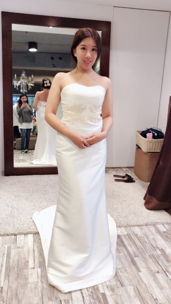 很快我們就開始試穿婚紗,謝謝海哥推薦的Joanna Wedding經典婚紗,老闆娘Sabrina的精準和專業,很快就找到了我心目中屬於新娘最純粹的白色輪廓!