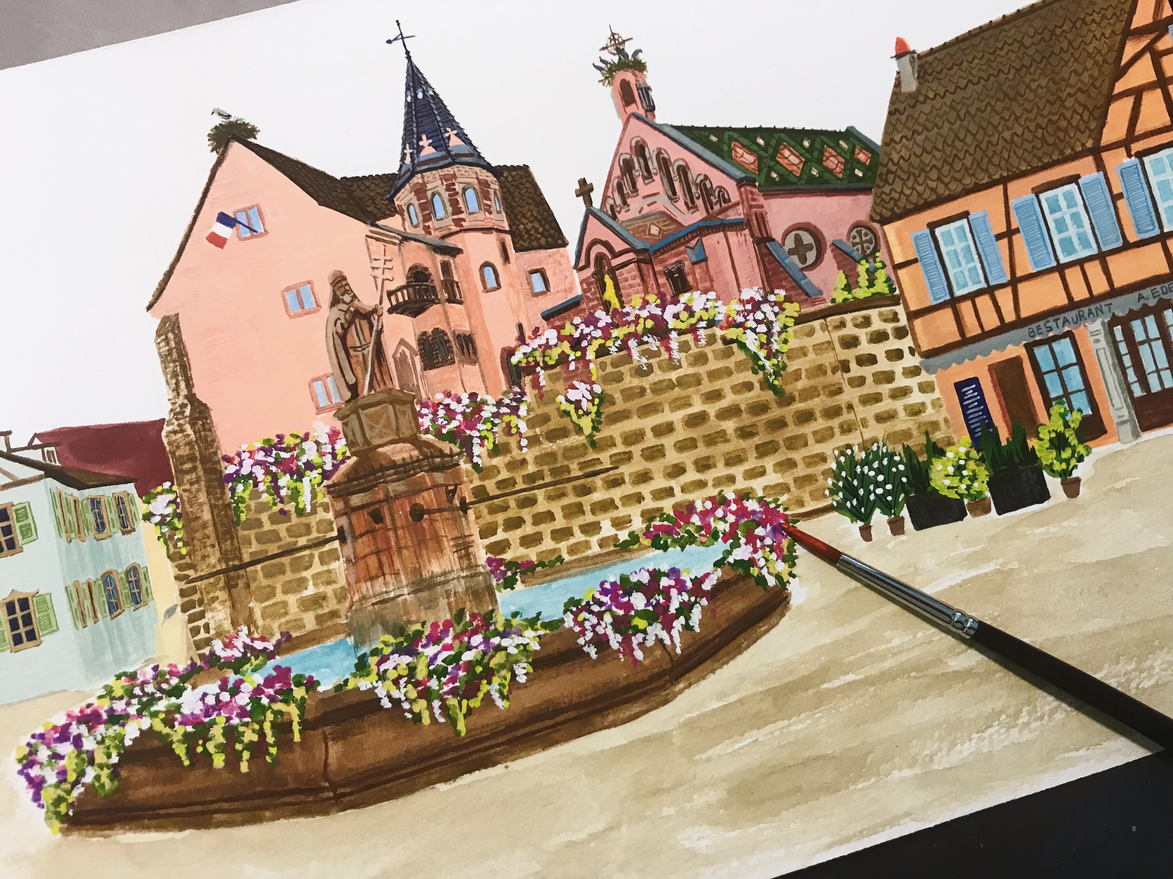 特別適合Jubie的手繪風格,飽和又粉嫩的色系呈現了建築粉刷的彩色牆面,