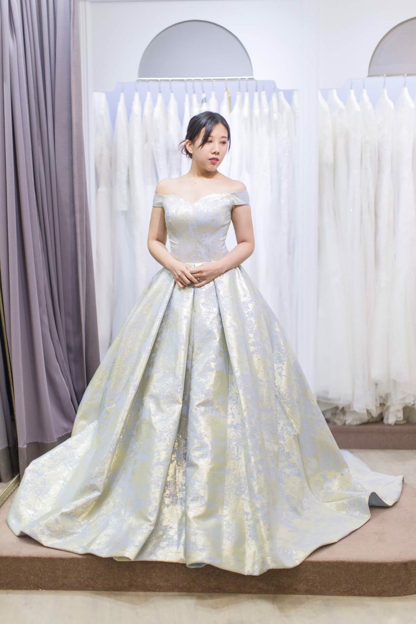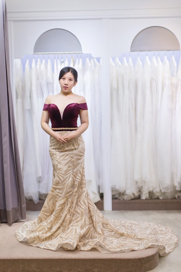 這件有著磅礡氣勢,又不落俗套的大裙擺,是我一眼就相中的禮服。鉑金雲紋搭配緞面的設計,時尚又獨特,完美的版型為身材大加分,看那裙擺的弧度澎得如此恰到好處,完全就是我的菜。不只掛在衣架上就以惹人注目,穿起來更是美得無可挑剔!也是宴客禮服的超棒選擇!