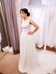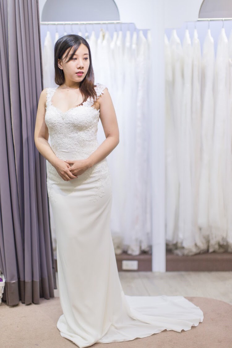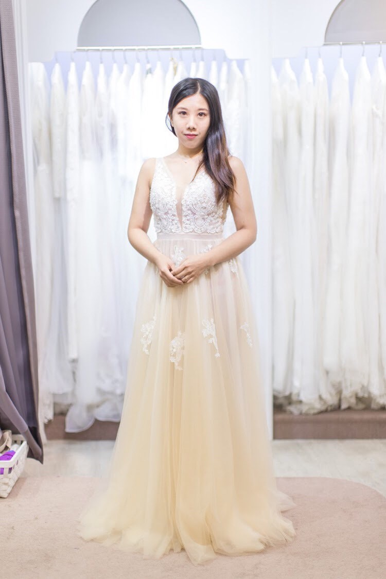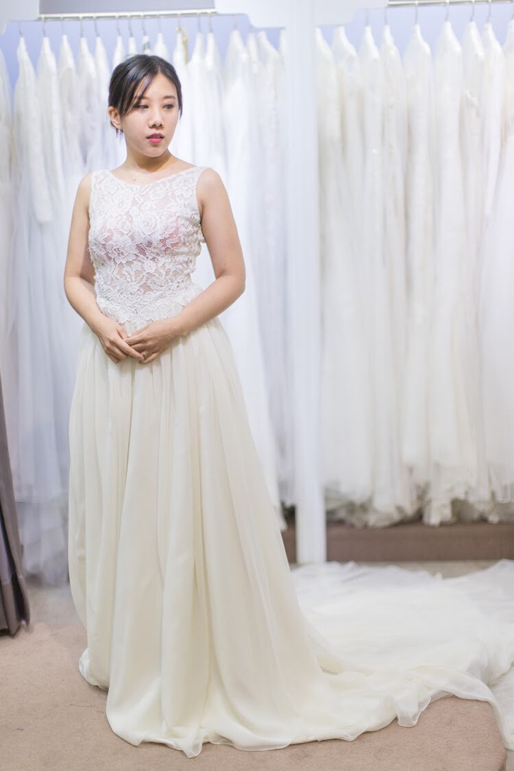 奉勸各位姐妹,如果要帶老公去試穿,請先確保他會拍照:)否則像這件,紡紗垂墜的裙擺,簡單的上身設計配上不簡單的玫瑰蕾絲,如此優雅的禮服…
