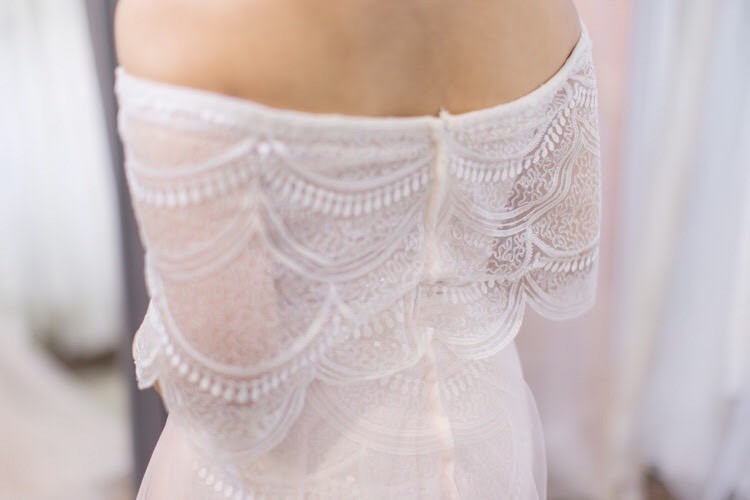 工作室二樓,婚紗一件又一件,一色傍著一色,四面牆的禮服圍成了新娘專屬的調色盤。這該怎麼挑啊?眼神飄向禮秘,殊不知專業的搖籃禮秘已把我摸透透,熟練地穿梭在其中,拿起一件件禮服等著我套上。搖籃的婚紗風格簡單素雅,如同我一直追求的乾淨與純粹;禮服很簡單,珠飾比較少、強調蕾絲的精緻與質感、白紗比例也比較高。