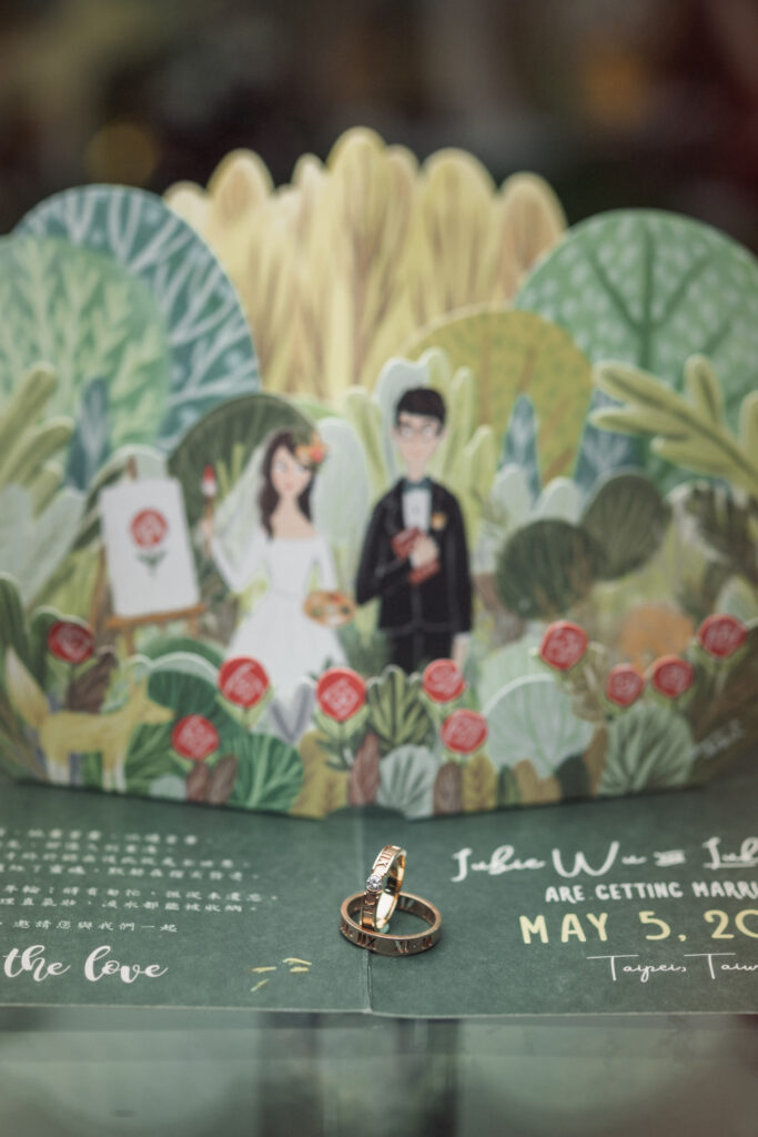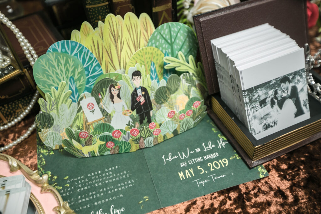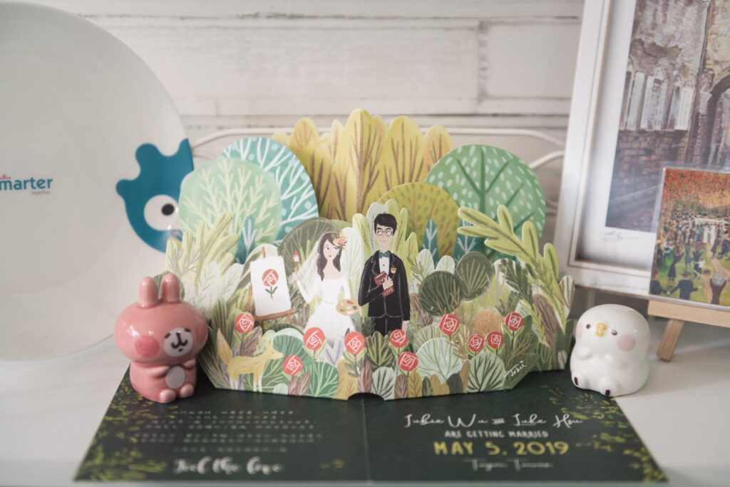 其實是因為我希望我的立體喜帖,可以像是一個禮物、一本立體繪本一樣,被大家收藏著,也能放在家裡裝飾。所以我在立體喜帖裡面,並沒有寫太多我們的宴客資訊或是主婚人姓名之類,而是寫上一個短短的關於我們相遇的故事。