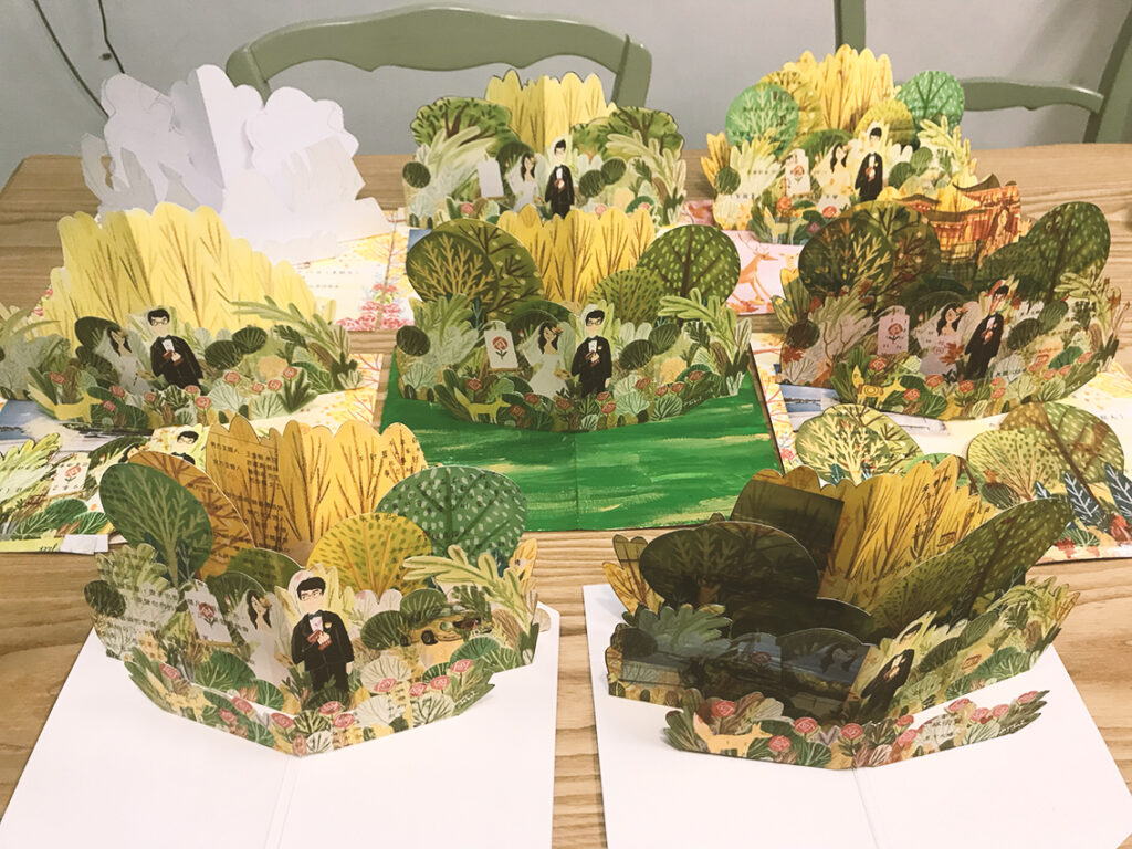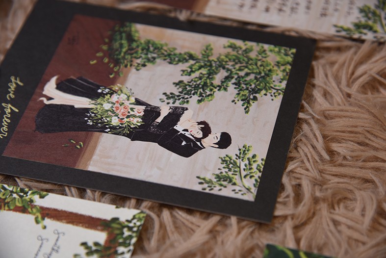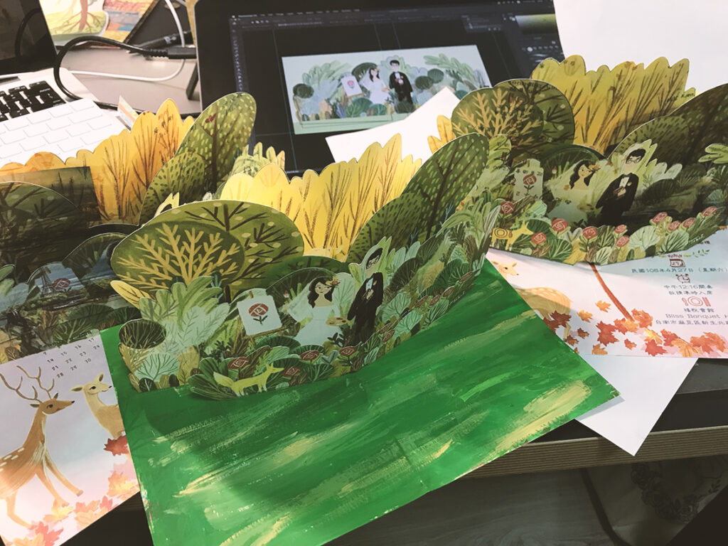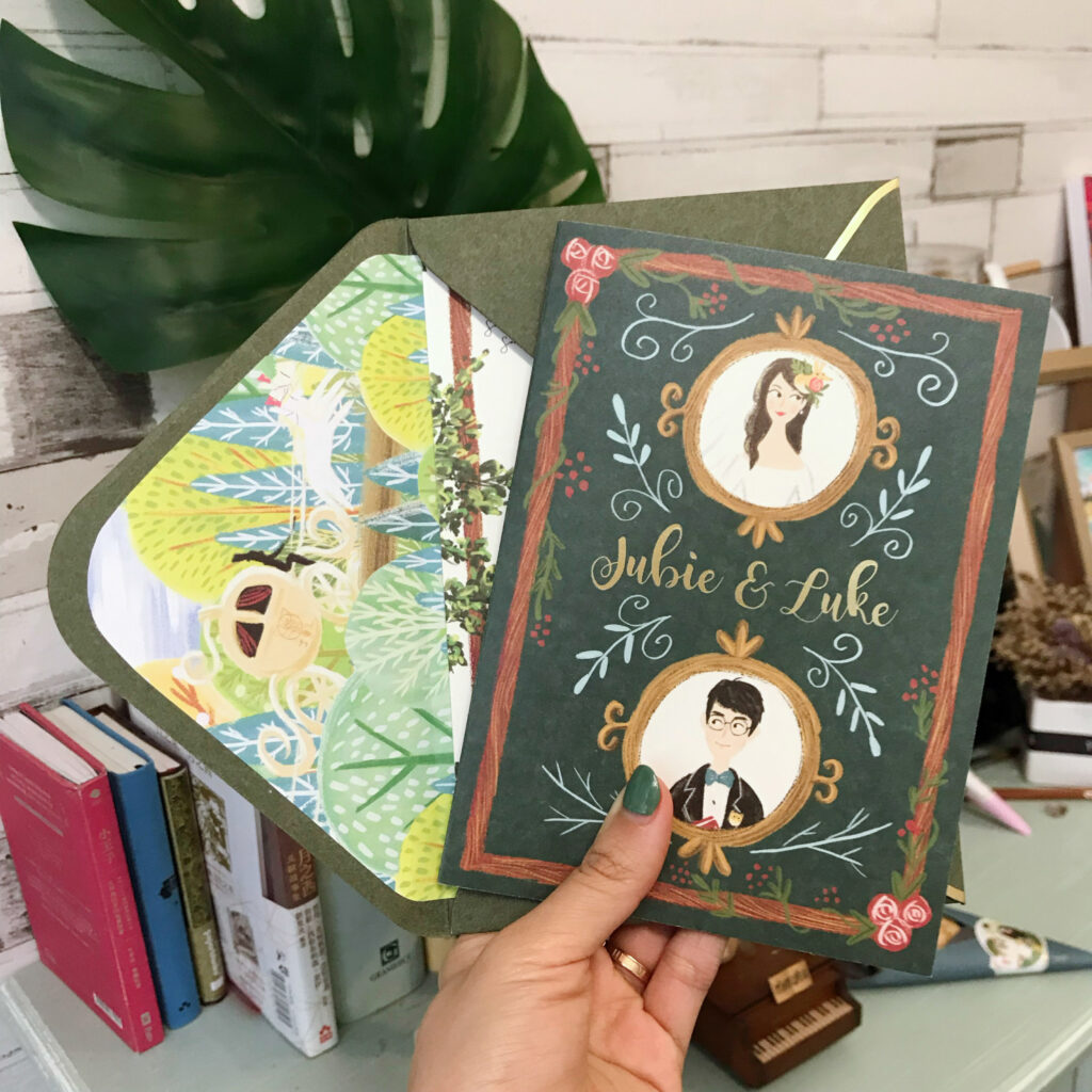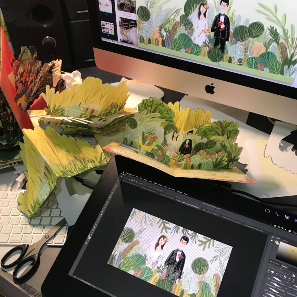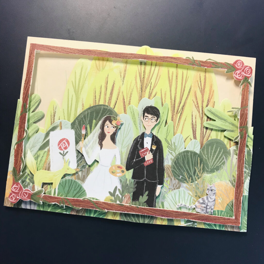 這幅我們自己的立體喜帖,其實一開始的構想非常簡單,就是想畫一幅很多樹的場景。除了因為喜歡森林風的感覺,更多是因為當時時間緊迫,畫樹比較容易哈哈。