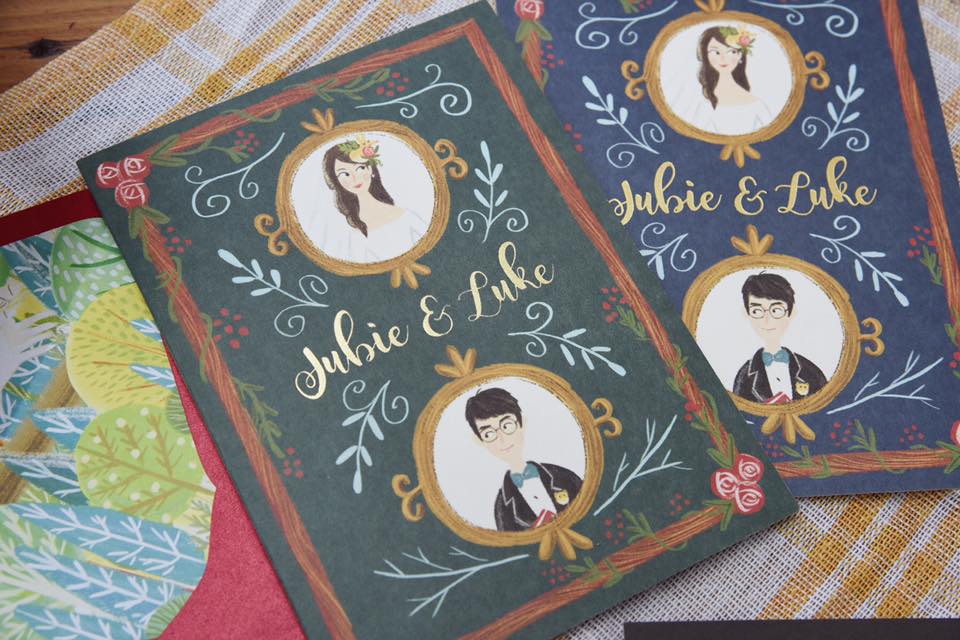 因為立體喜帖打開就像一本立體書,因次我希望封面的設計,也可以有書的感覺。所以我就利用一些歐美古典文學會有的邊框、相框、英文花體等元素,搭配同一色系的底色,簡單又不失風格的設計,也可以讓大家打開之前不會被圖案破梗!
