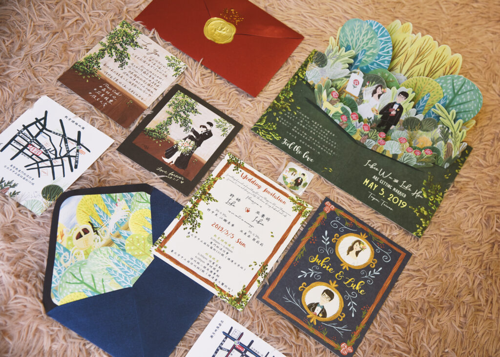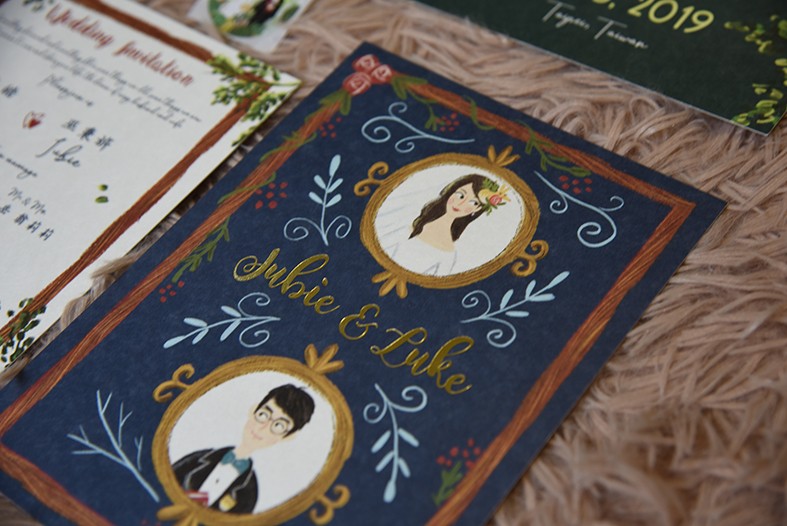 色調部分,我特別使用了一般新人在喜帖上比較少使用的深綠、深藍色系,色彩也盡量不花俏,主要以藍綠色為主,甚至有一些周邊使用黑色系做點綴,就是希望可以給大家更多關於喜帖的想像!