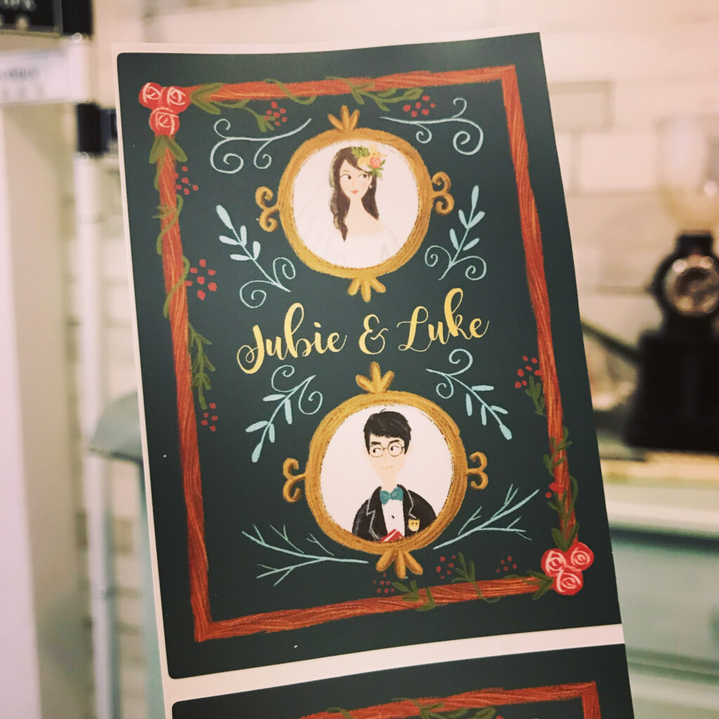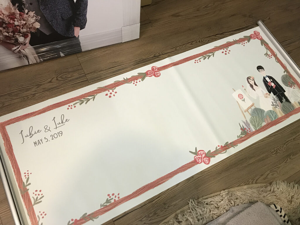 人物也是走歐美插畫風格,這種插畫風格,其實是我自己很愛,也是我平常創作的風格唷!雖然不是流行的似顏繪,但新人的特色都有強調出來,朋友也都說新郎很像本人哈哈!