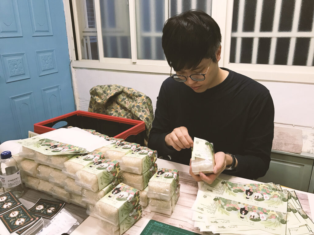 袋子裡還有一人一個包囍米,是我們自己去新竹找到無農藥自然農法的田地,自己扛了好幾袋稻穀回來,自己脫殼精米包裝的唷!