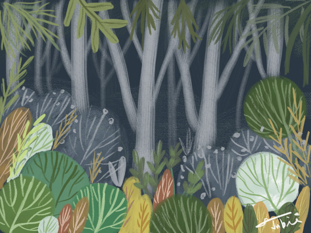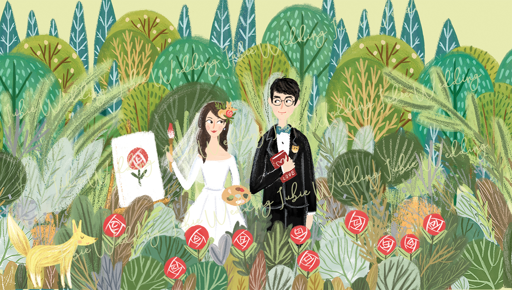 因為自己的喜帖不需要跟誰對草圖,所以其實這幅喜帖我就跳過草圖,想到什麼就畫什麼。東一點西一點,最後就畫出了一座小森林。