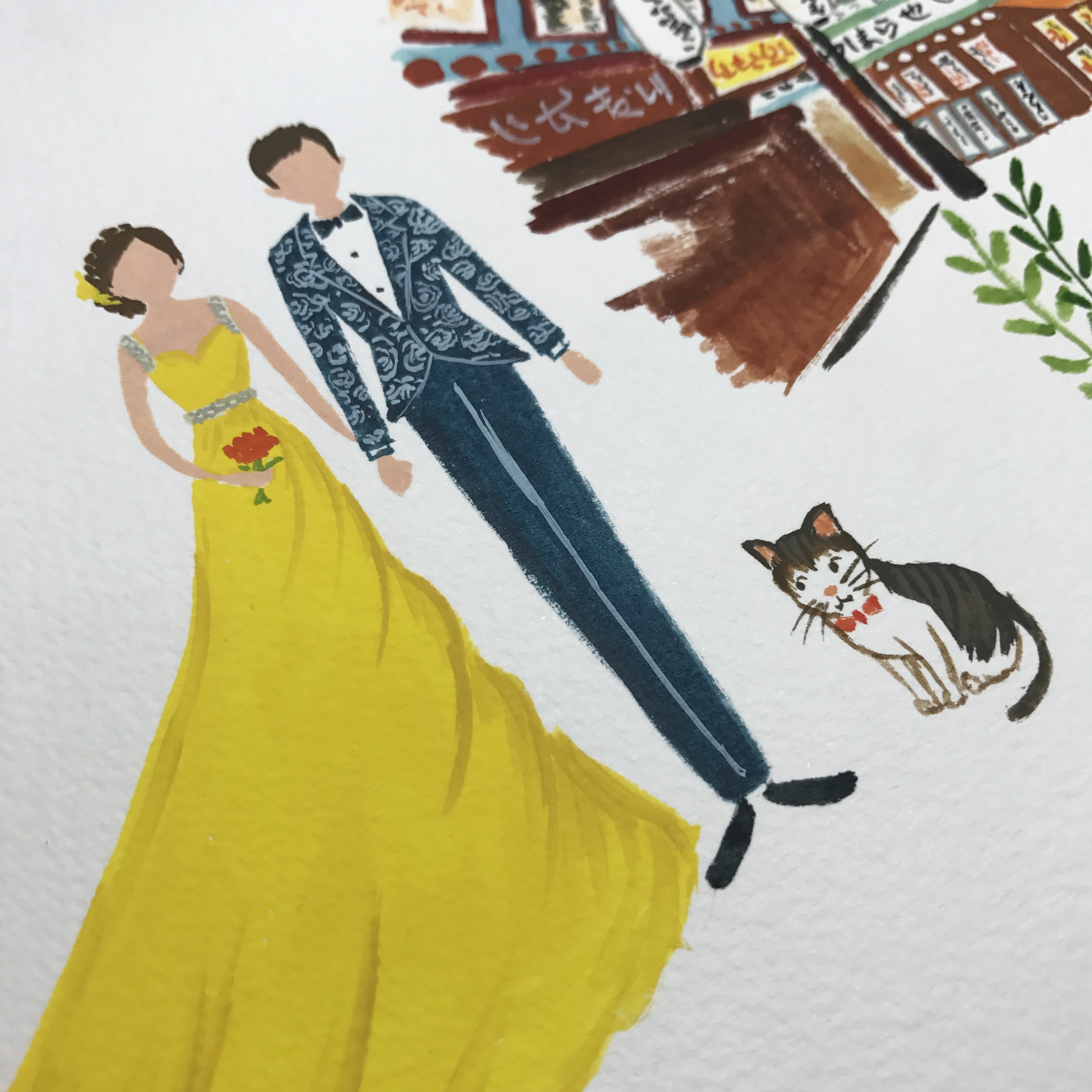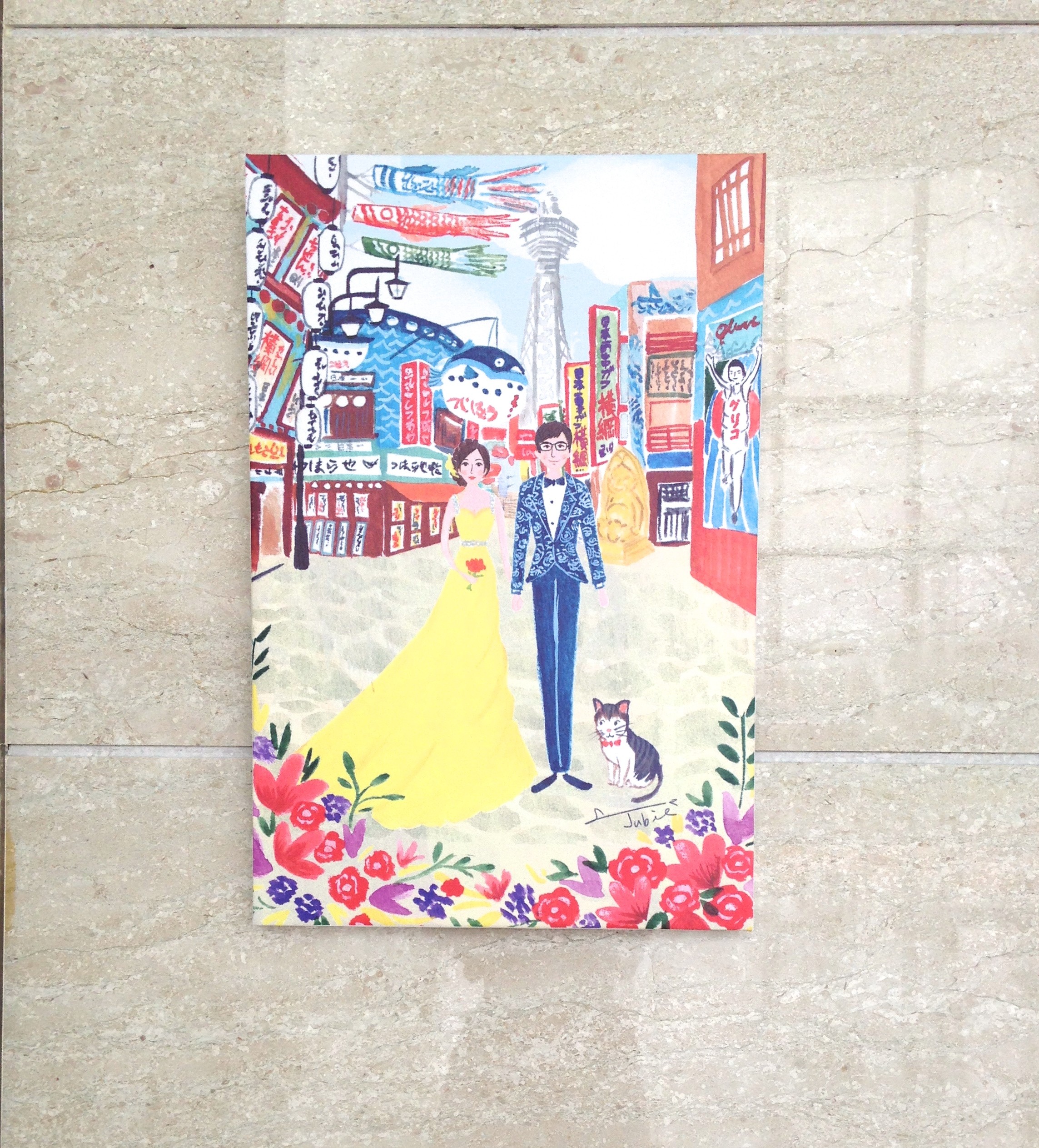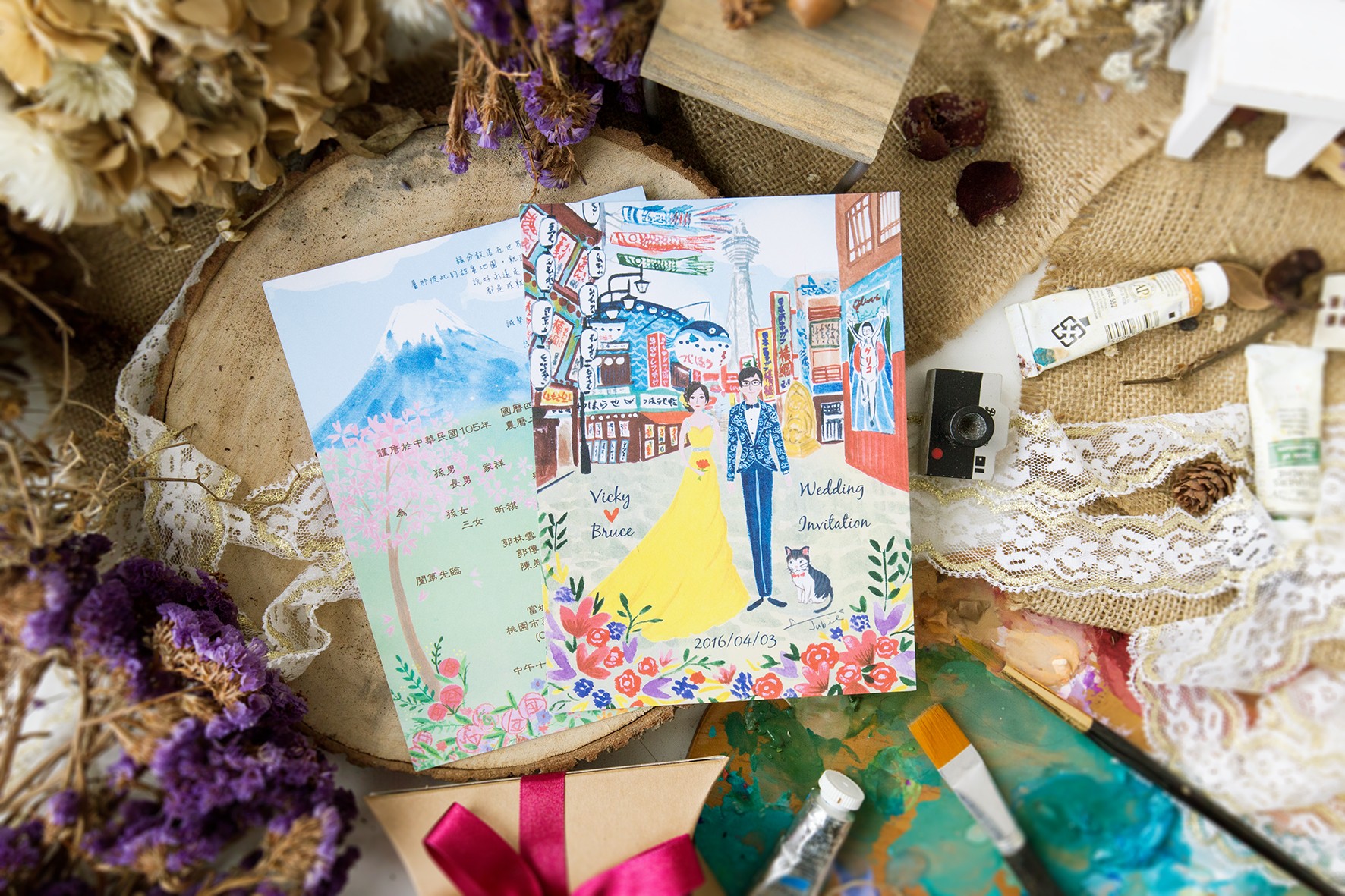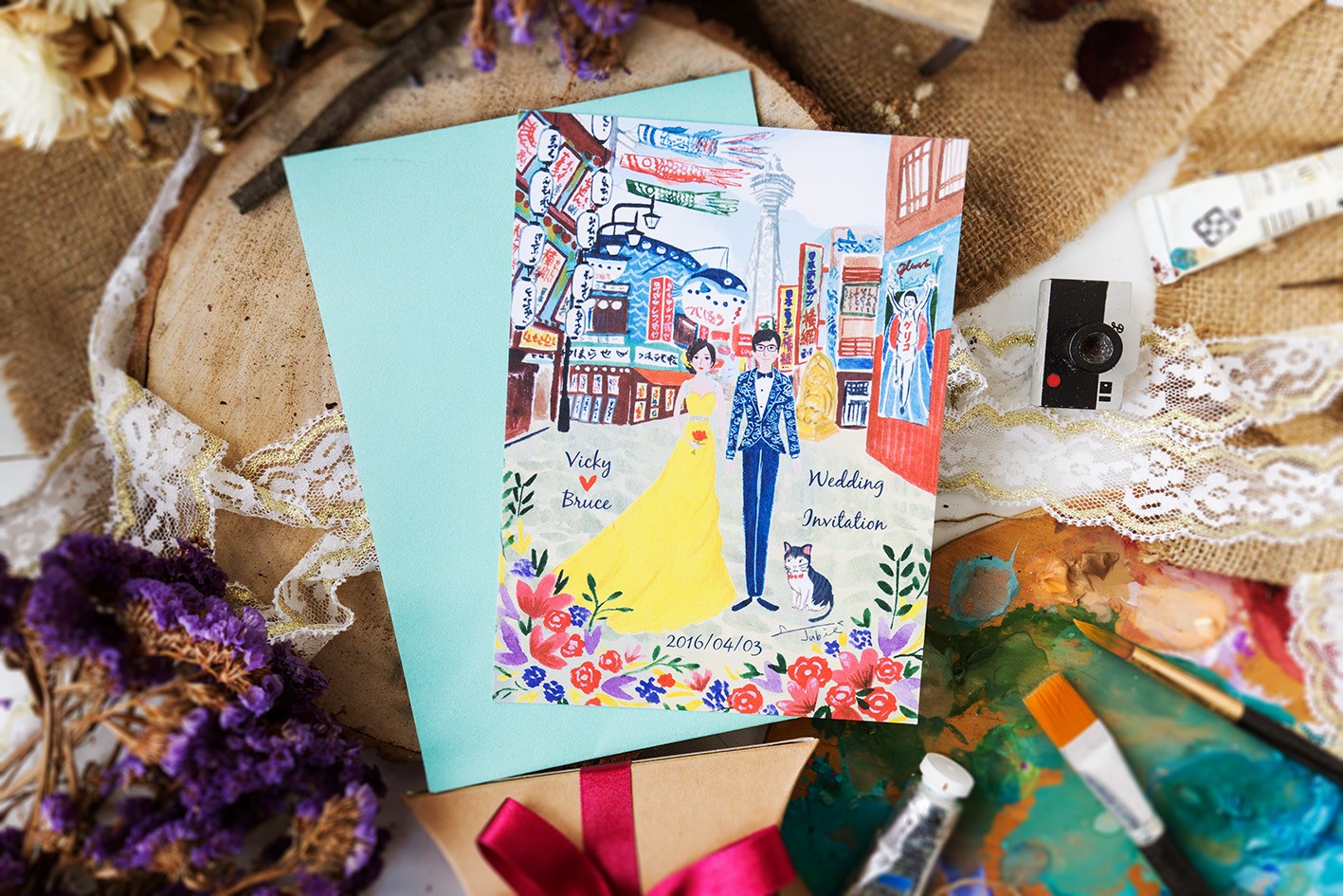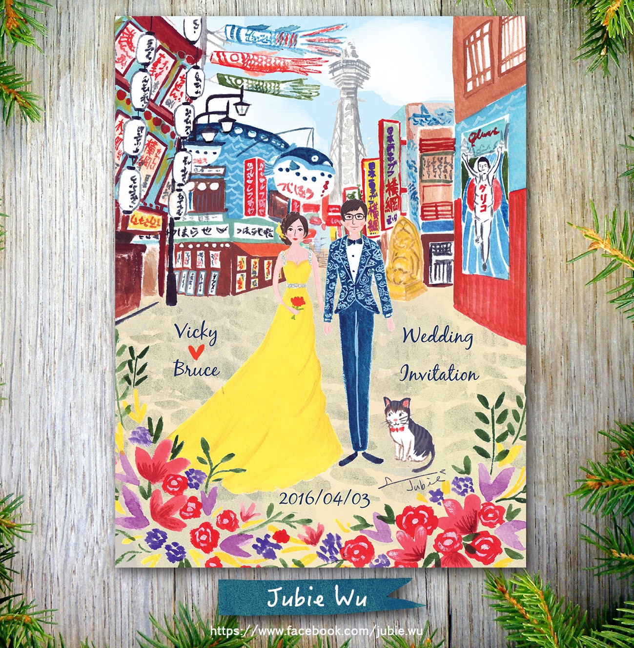 一開始跟Vicky&Bruce洽談的時候,兩個人對於要畫怎麼樣的內容其實還沒有很清楚的想法~但儘管如此還是因為喜歡Jubie的風格,所以找了我來幫他們製作,這樣的支持和鼓勵讓人超級感動!於是Jubie便在洽談過程中慢慢引導兩人的想法,東聊聊西聊聊,不知不覺慢慢的就有了喜帖的雛形!想要畫兩個人蜜月要去的大阪,以大阪新世界的背景為主題,兩人牽手站在畫面中央,加上家裡可愛的小貓!最特別的是兩人對於服裝非常有想法,一襲黃色的禮服加上玫瑰花紋的西裝,真的是非常漂亮!