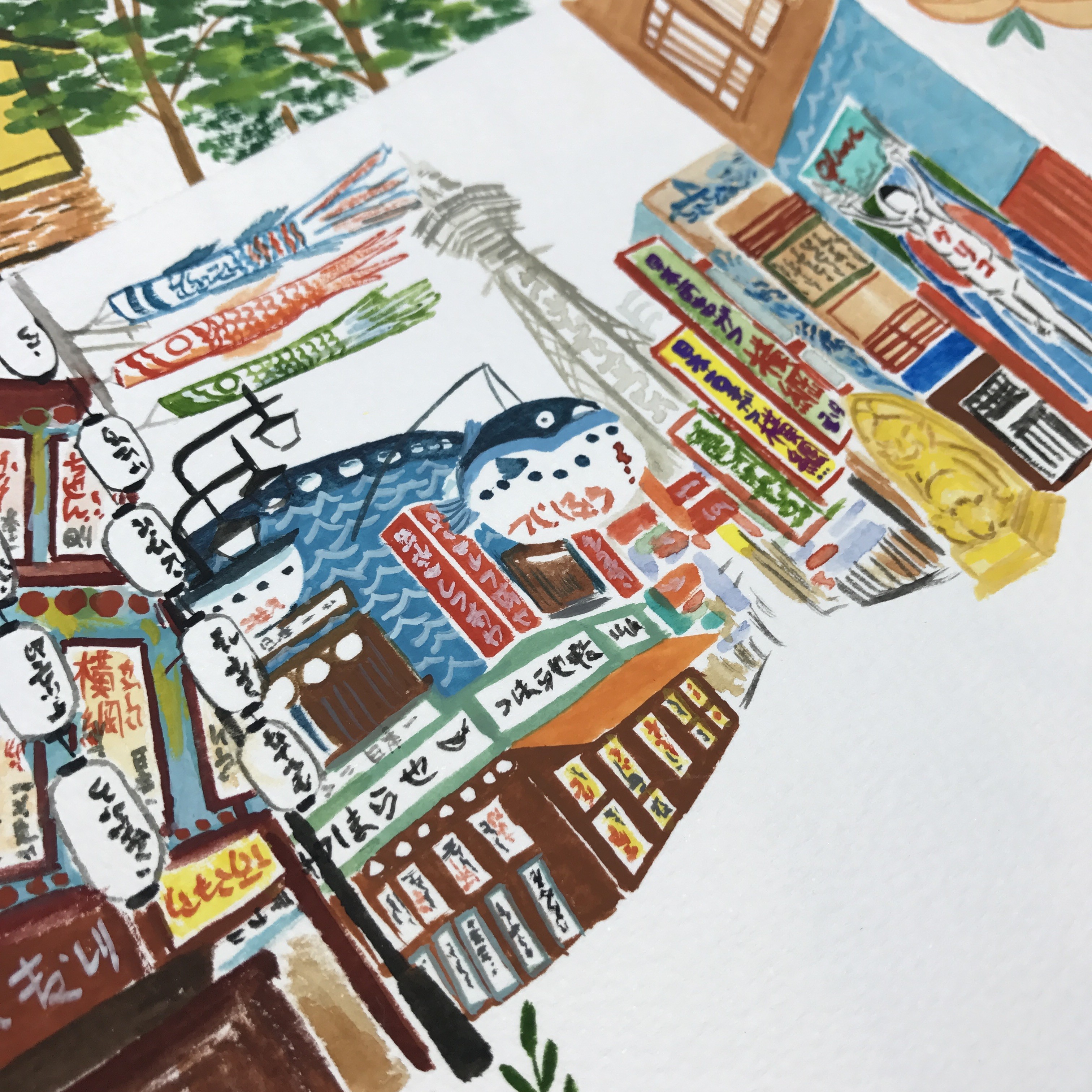 大阪新世界的街景在Jubie的水彩下一點一滴浮現啦!可愛的招牌、店家和滿滿的大阪風情!繪製的過程中充滿挑戰卻也非常享受,繽紛又細緻的水彩讓整張喜帖更令人期待啦~