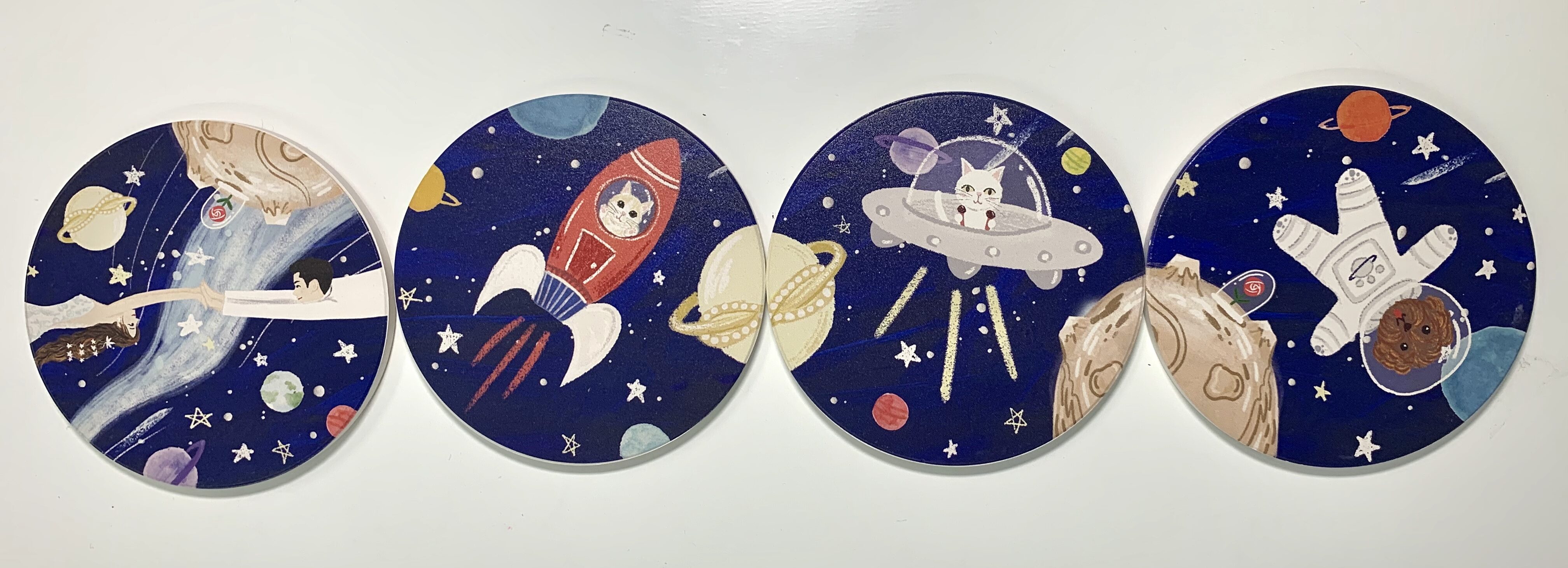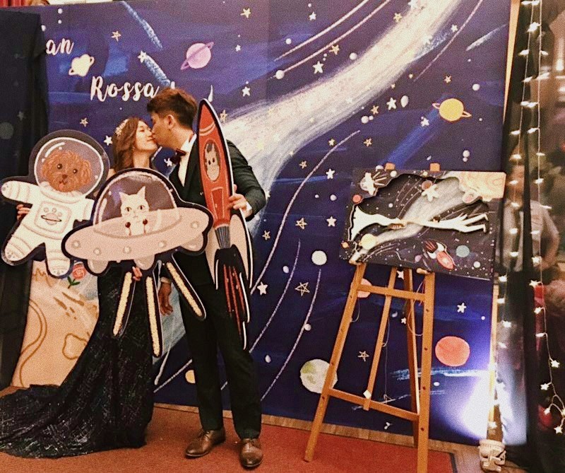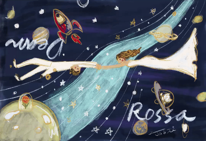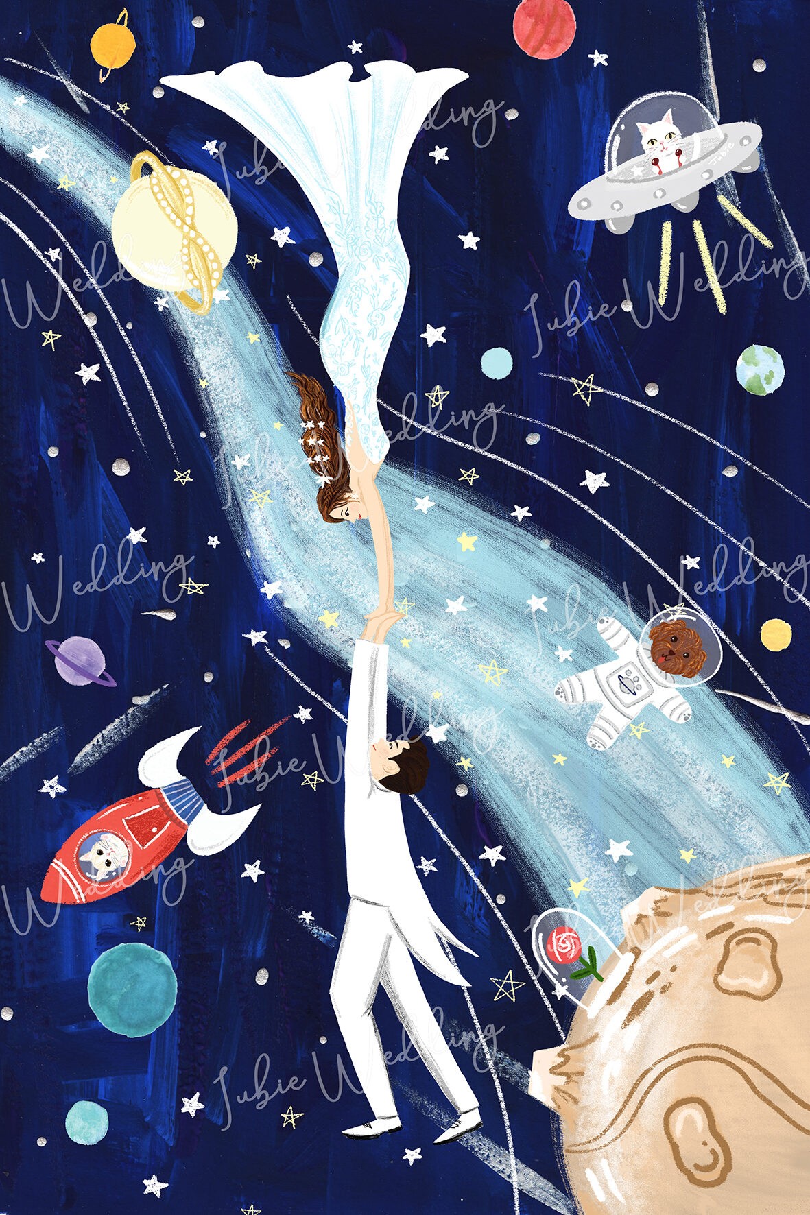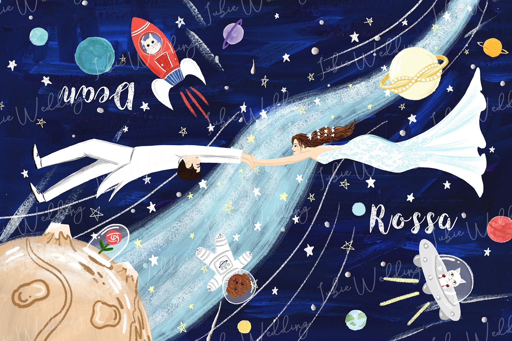 但Rossa非常喜歡太空這個點子,而就誕生了這幅,無重力銀河浪漫婚禮小卡!
