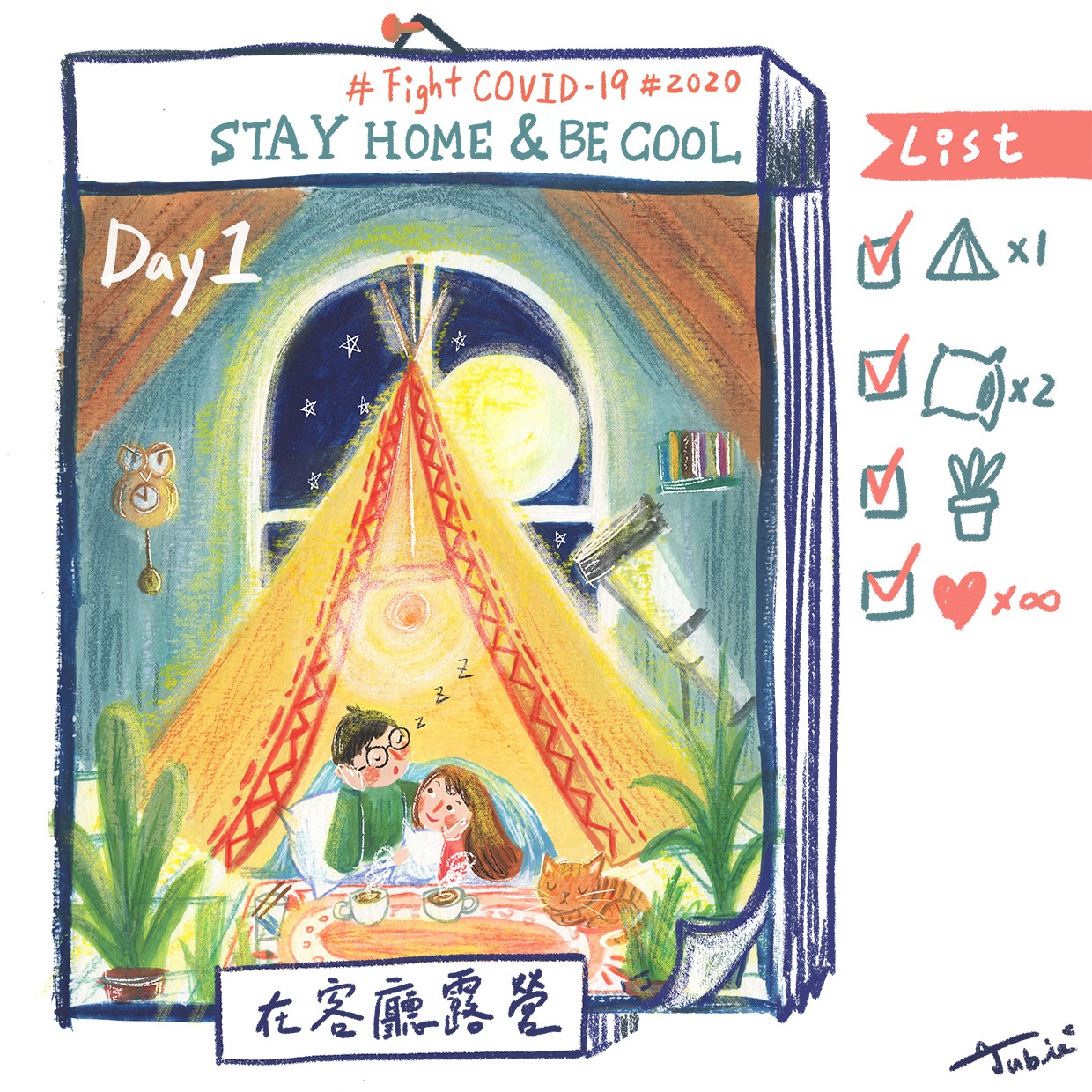防疫著色插畫|Day 1 在客廳露營